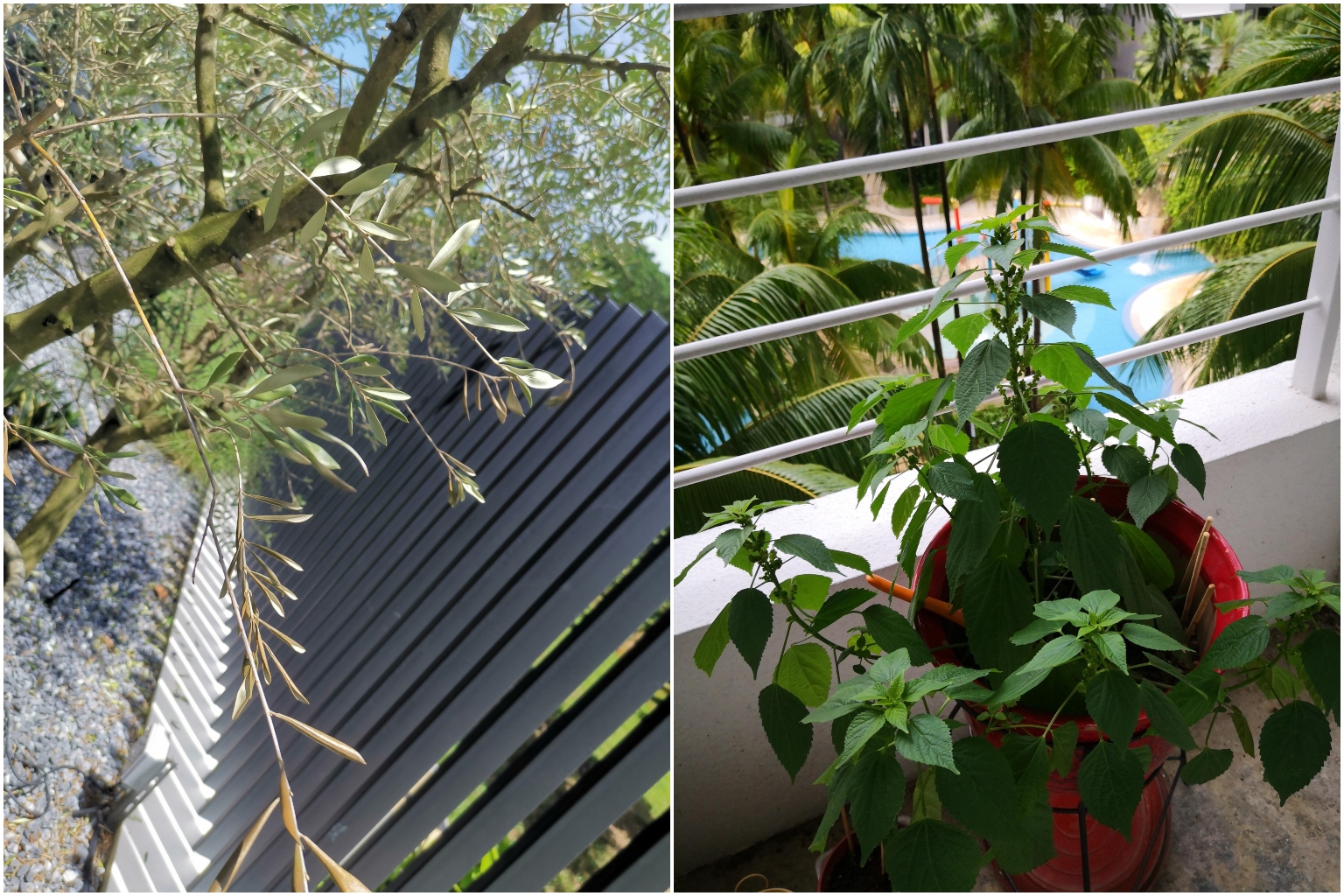 Olive trees (left) can be tricky to grow in tropical Singapore; and weed growing in plant pot is likely the Hawaii Woodnettle (right).