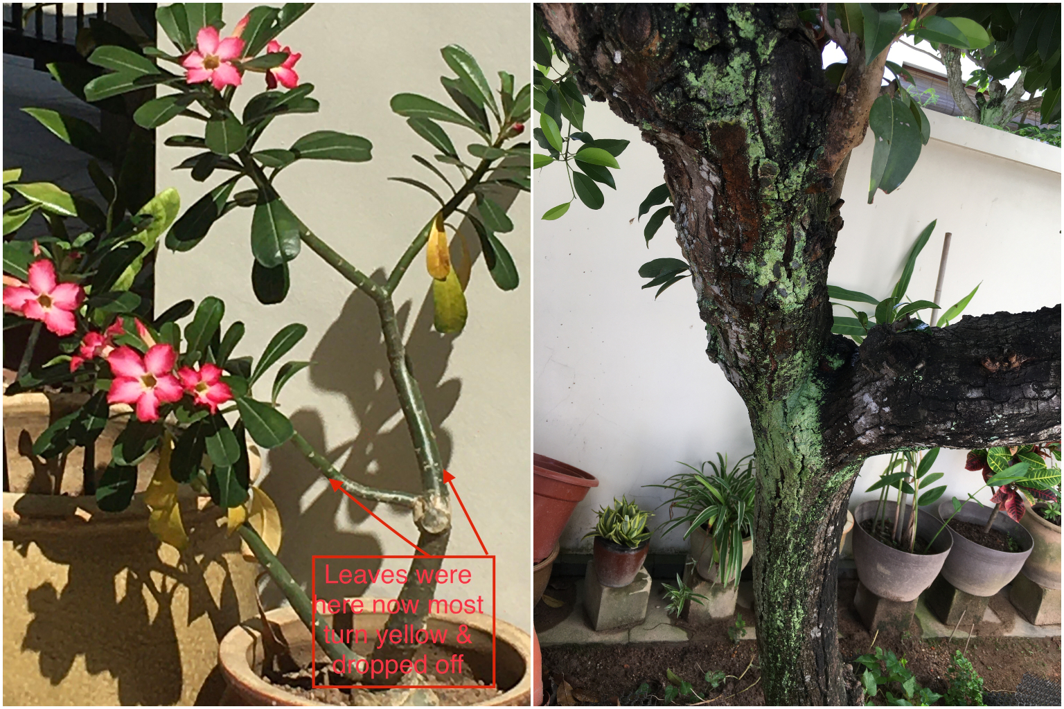Desert rose plant (left) and Chiku tree.