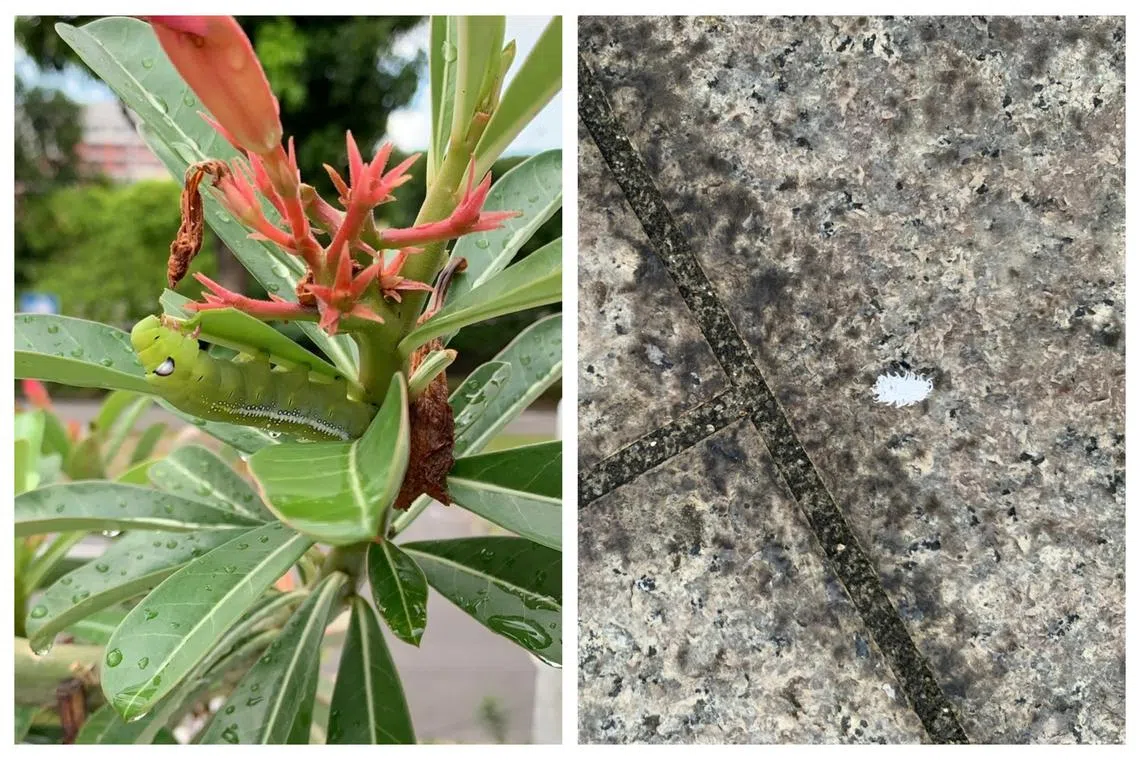 This desert rose plant is likely to have been infested with the oleander hawk-moth caterpillar (left) and mealy bug (right).