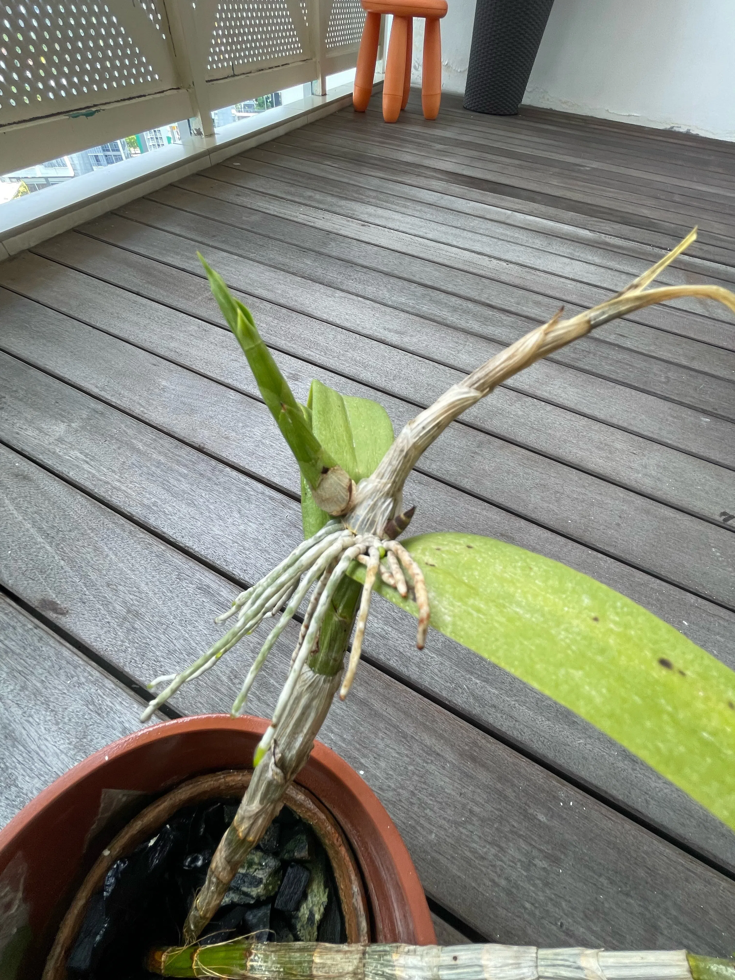 My orchid is growing roots at the top and I do not know how to repot it. Its existing roots and stem look weak. What should I do?