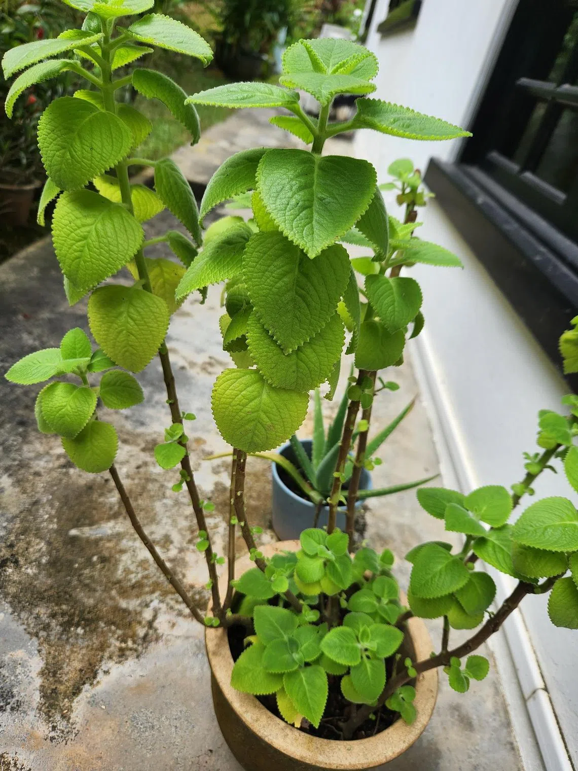 The leaves of my Indian borage have been turning yellow despite the plant having sufficient sun and water. When there is excessive rain, I take it into shelter. I have also tried cutting the taller plants and replanting them closer to the soil (the shorter plants at the bottom), but they continue to turn yellow. What is the cause of the yellowing leaves? Is it overcrowding or a lack of nutrients?