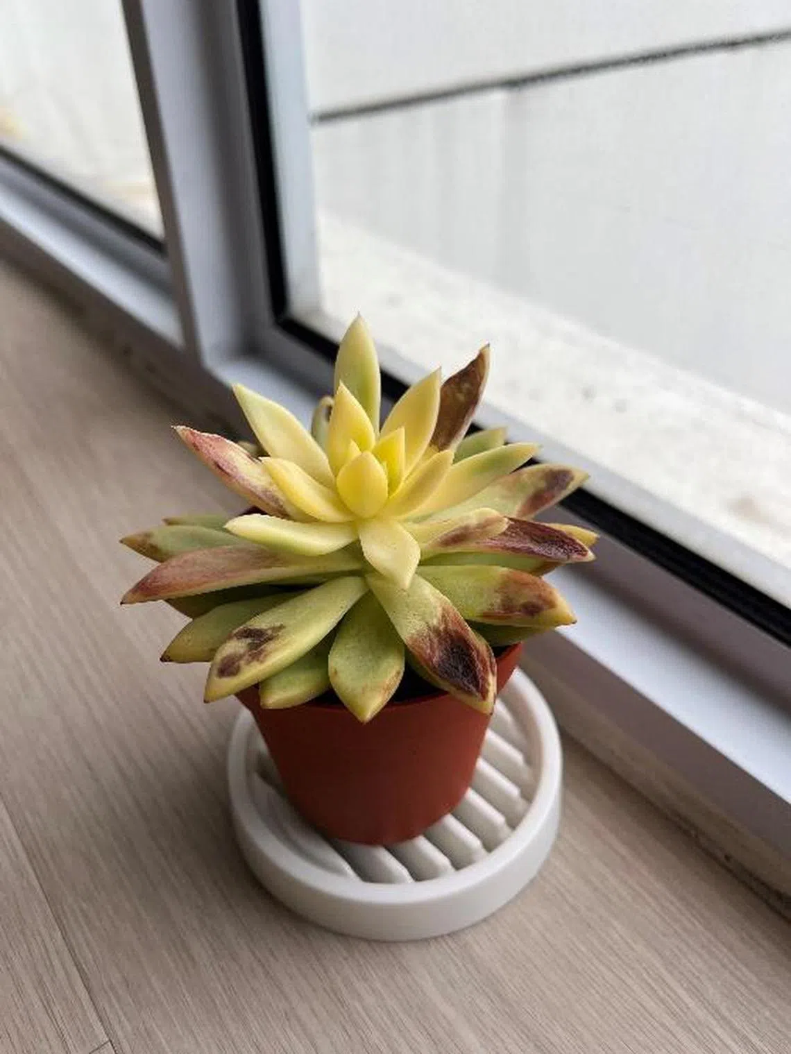 My succulent has brown spots and patches on its leaves. It is near a window that gets sunlight for about half of the day. What is wrong and how can I rescue my plant?