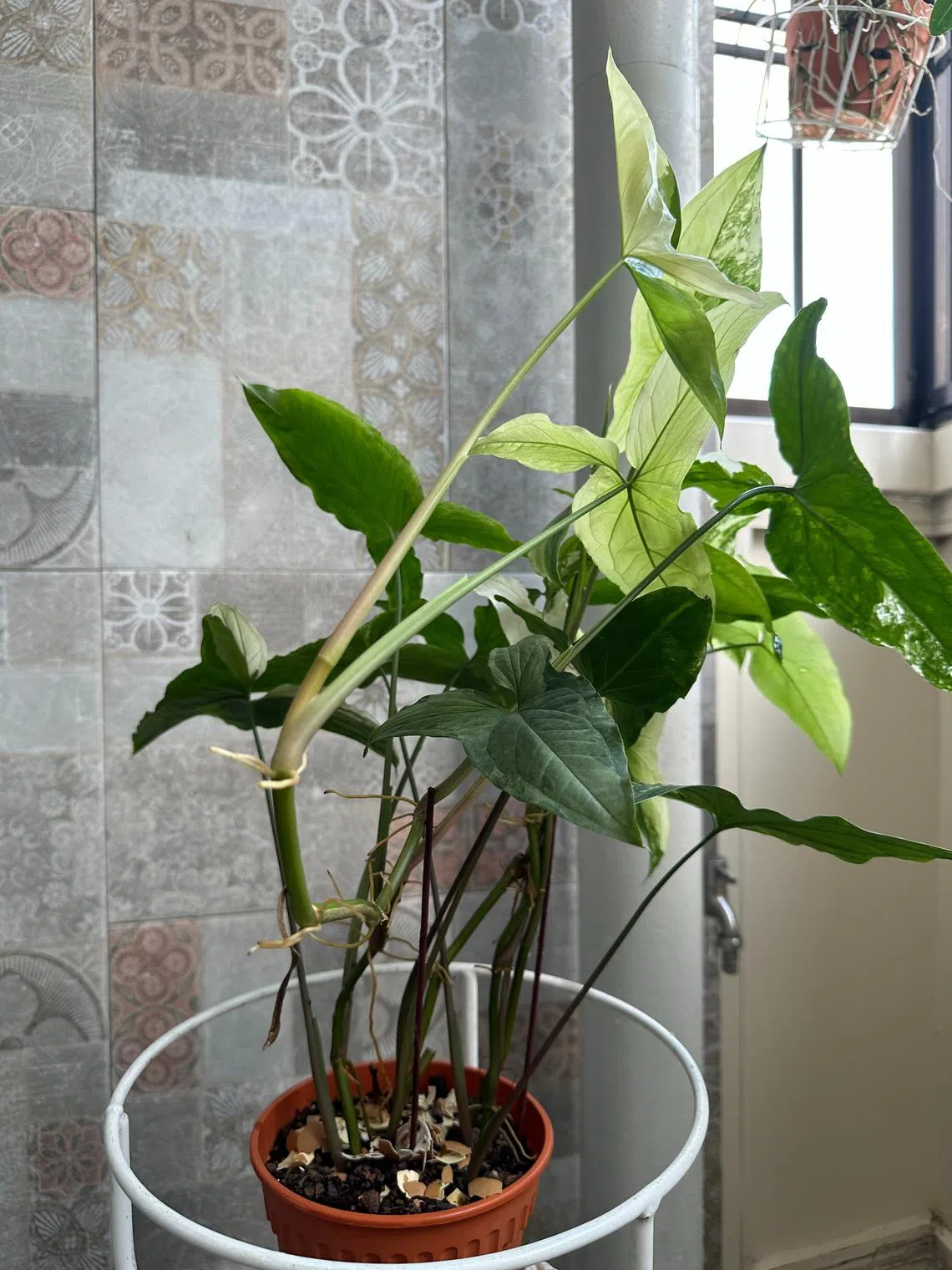 The plant with arrow-shaped leaves is the Goosefoot plant (Syngonium podophyllum). It will grow into a climbing vine and can be trained to grow on a vertical moss pole. Give it at least six hours of filtered sunlight a day. Shady conditions will lead to elongated stems that look stretched out.