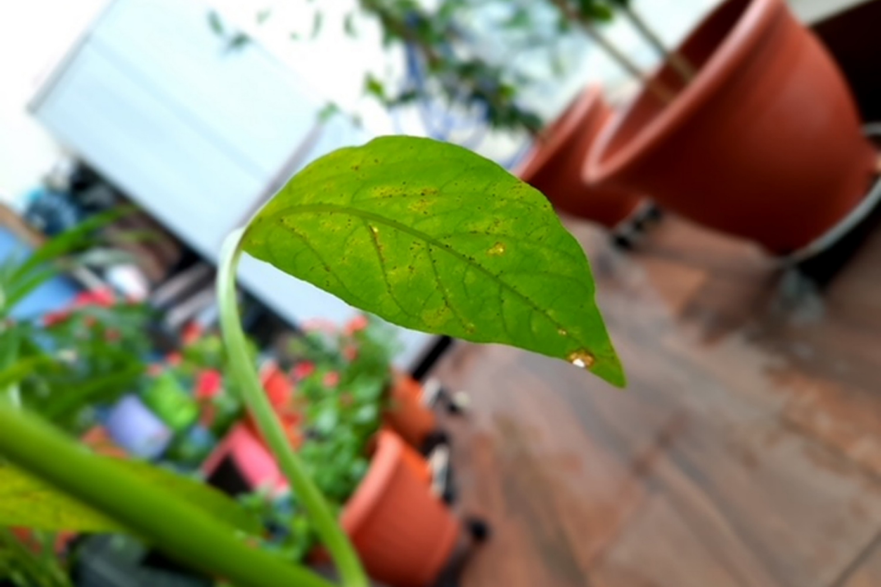 What is happening to my chilli plant? Several leaves have the same symptoms. I have sprayed an organic fungicide every other day for a week. What can I do to stop the spread?