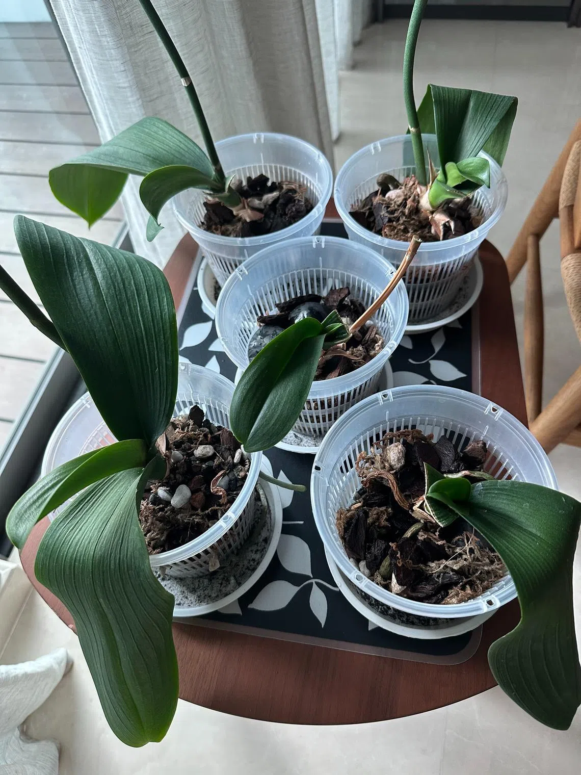 Your moth orchid (Phalaenopsis) plants do not seem to have enough water. The leaves are limp and shrivelled. Water regularly and allow the plants to dry out between watering sessions, but do not leave them without water for too long.