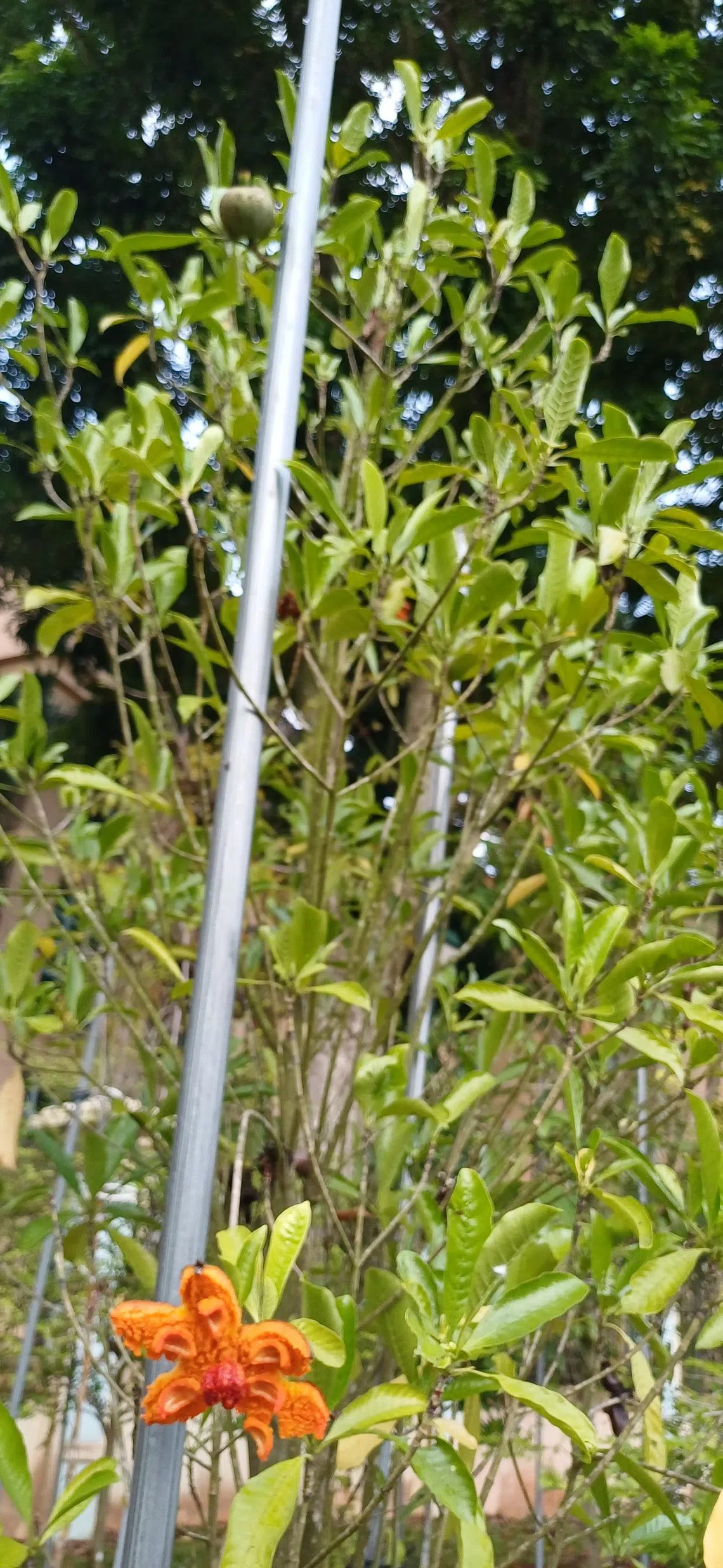 This plant is the Golden Gardenia (Gardenia tubifera). It is native to Singapore and grows into a tree over time. It produces yellow flowers. The structure in this photo is a mature fruit that has split open to disperse its seeds.