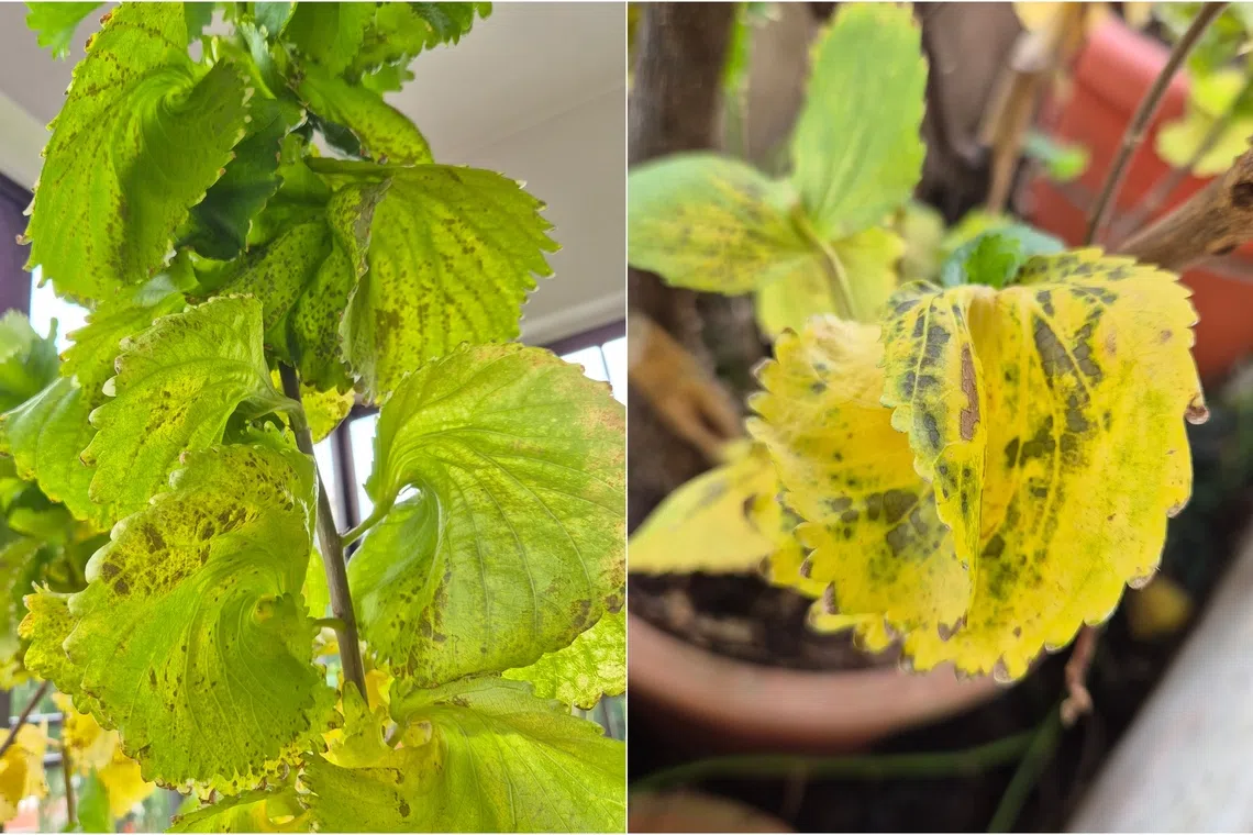My late father’s plants were thriving, but their leaves have started to turn yellow with brown patches. According to Google, these are copper plants (Acalypha wilkesiana).