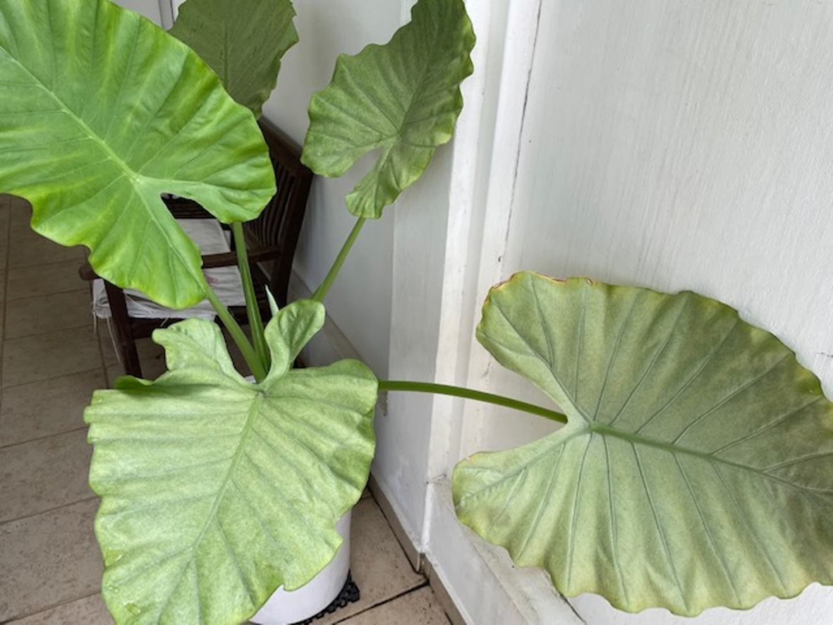 My elephant ear plant was growing well initially, but the leaves started to turn whitish a few weeks back. What is wrong?