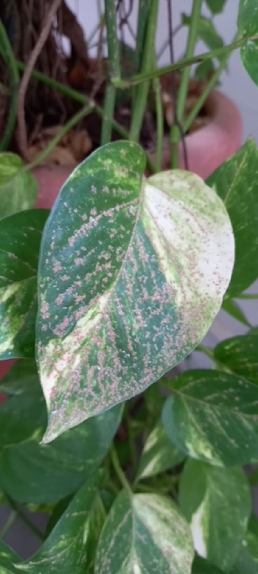 Your money plant (Epipremnum aureum) is badly infested with scale insects, a type of sap-sucking pest. Over time, it may weaken and deteriorate. Peppermint water is not likely to be effective in dealing with the pests.