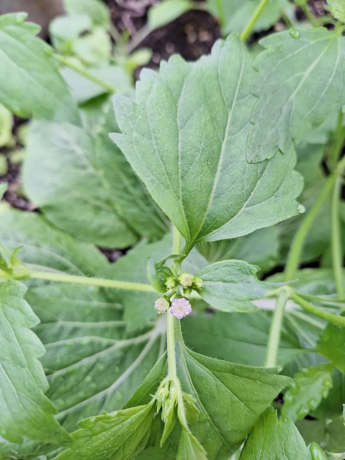The plant looks to be the Billygoat weed (Ageratum conyzoides) and has uses in traditional medicine.