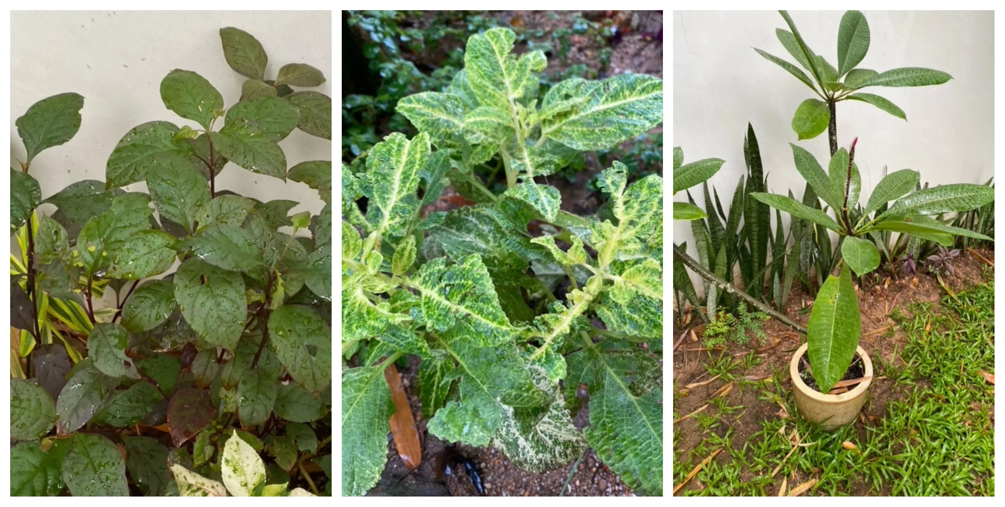 (From left) The Alternanthera and Coleus may have a pest problem, while the frangipani tree may lack sunlight.