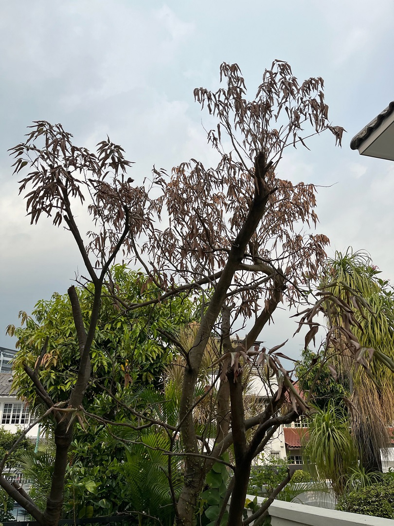 My "mata kuching" tree was growing very well but not fruiting, and I pruned it. The leaves recently started to dry out. Is the tree dying?