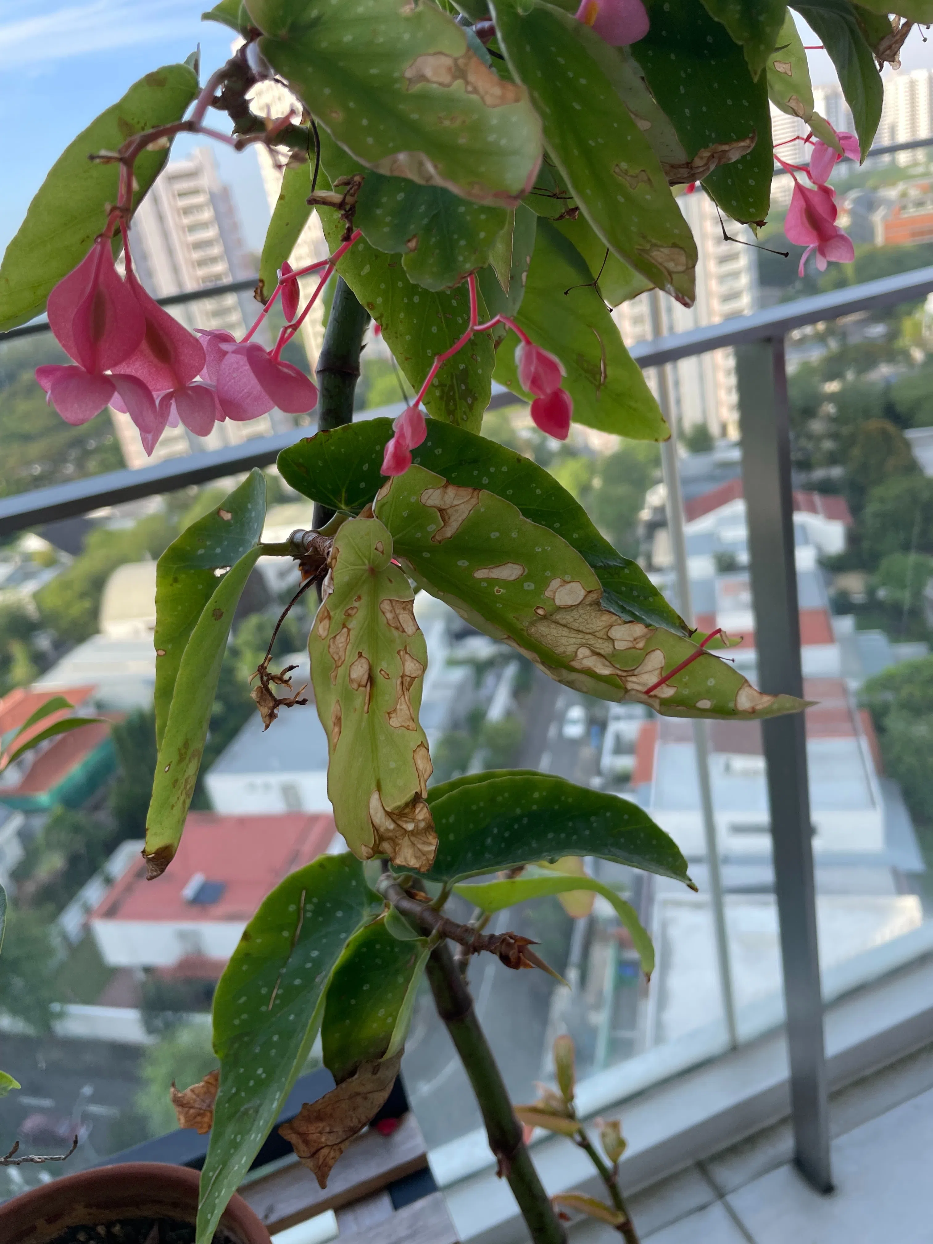 The tips of my begonia’s leaves have started to dry and shrivel up, while some leaves have brown patches. Why is this happening? The plant is in a pot on my balcony and gets sunlight all day. I fertilise it with pellets about once a month.