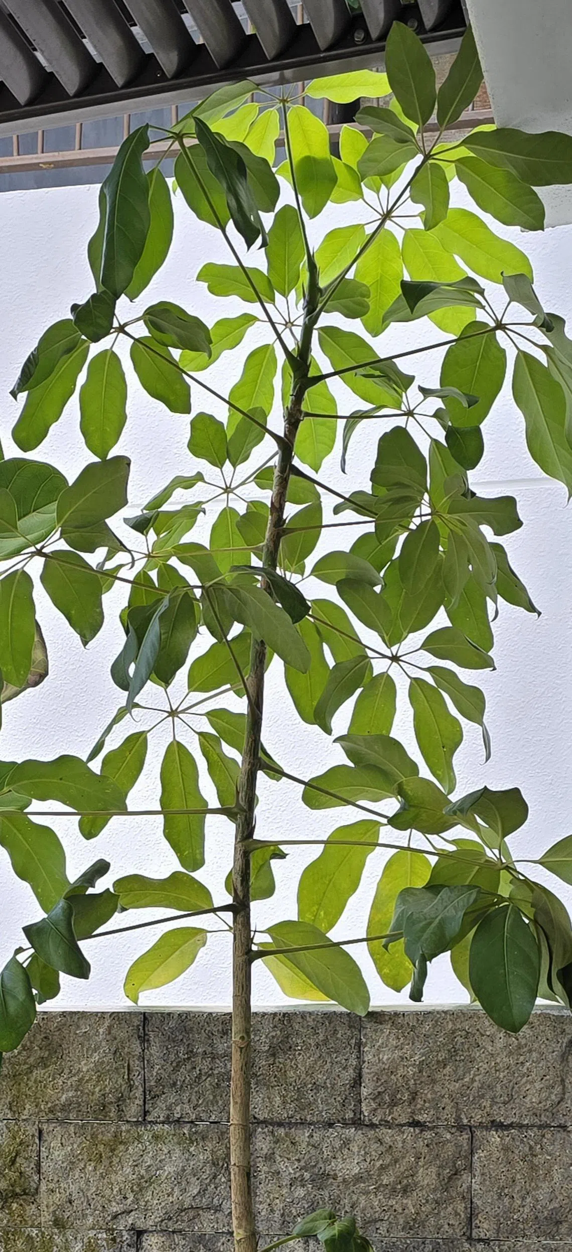 The top half of this plant is producing more leaves as it gets more light than the lower half, which is blocked by a wall.