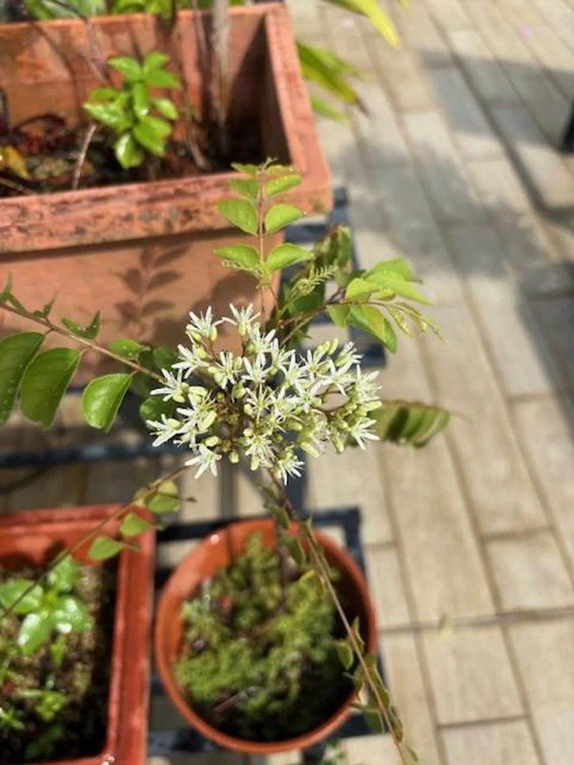 This plant of unknown origin has been growing in my pot. It seems to be a curry tree, but the branches are pinkish-red, while typical curry branches are green. It has white flowers and green, berry-like fruit which turn black over time.