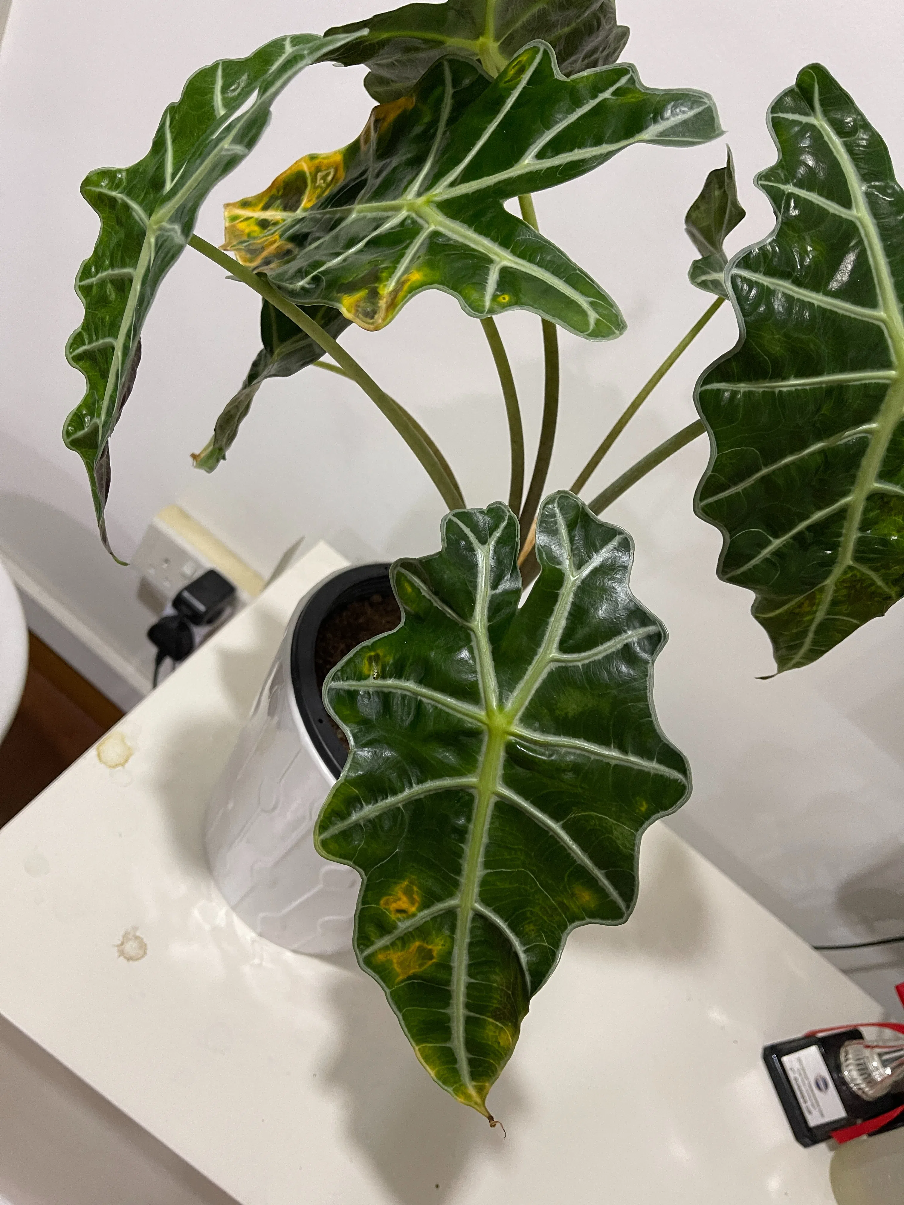 This Alocasia has fungal spots. Fungicides, which are available for sale in local nurseries, may be applied as a preventive measure.