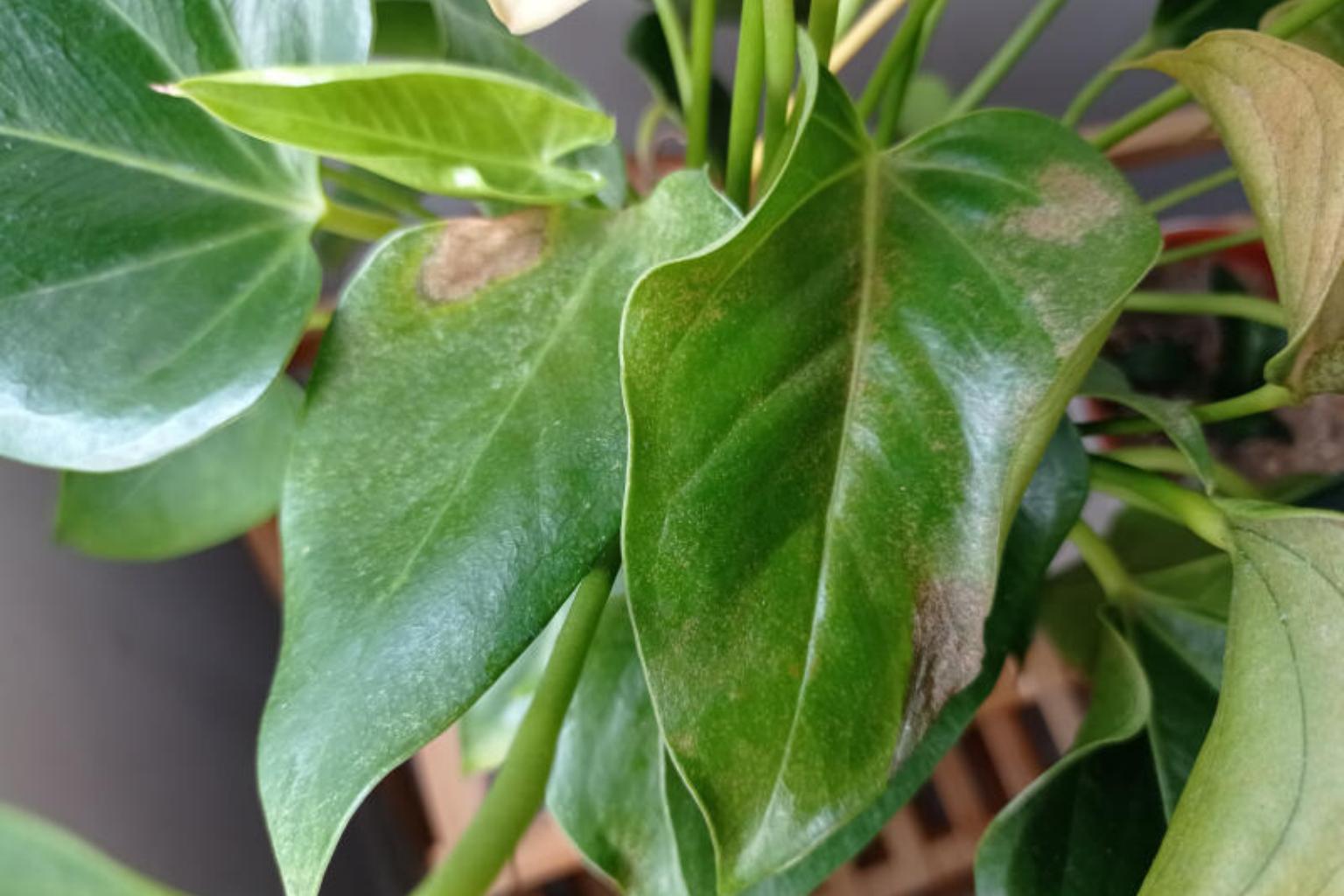 A disease is slowly spreading on the leaves of my anthurium. I do not see any pests. I have used neem oil, but to no avail. What is the cause?