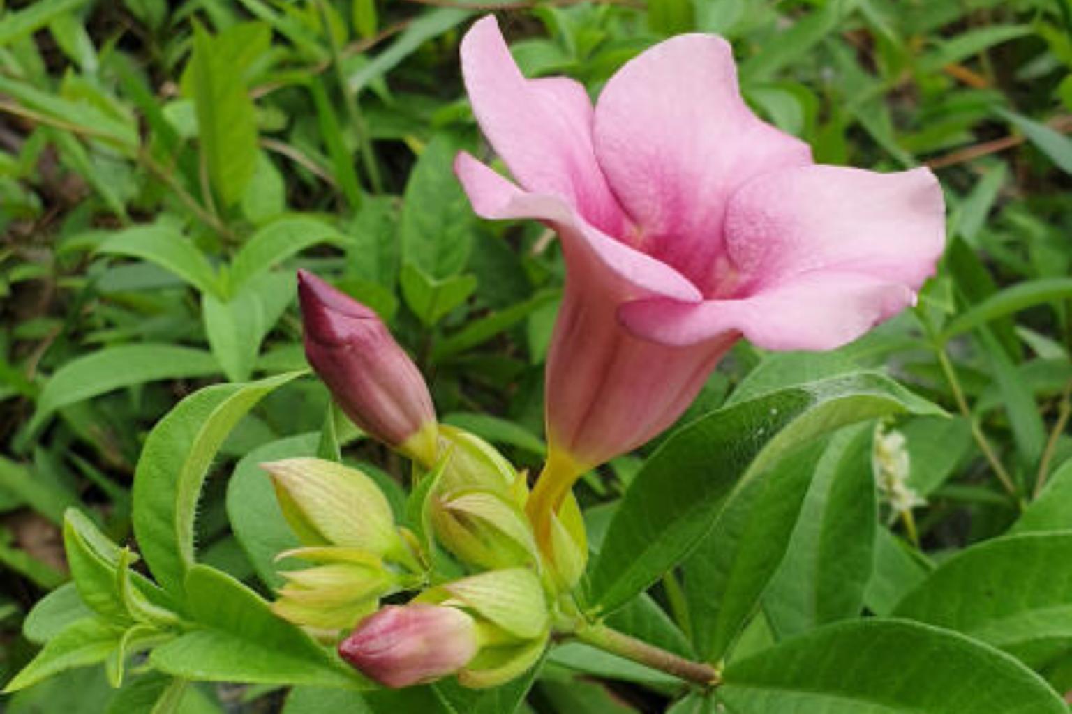 The plant is botanically known as Allamanda cathartica "Cherries Jubilee". It produces trumpet-shaped, pink flowers. The plant can grow into a large vine and needs a support for it to climb on. It requires full sun and well-drained soil to thrive and is propagated from stem-cuttings.