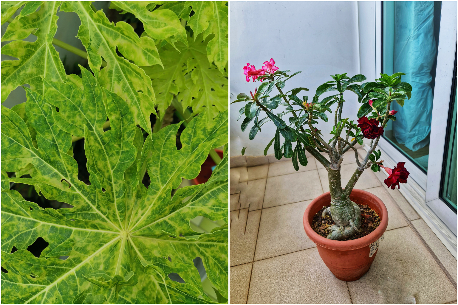 An infected papaya plant (left) and a grafted desert rose.