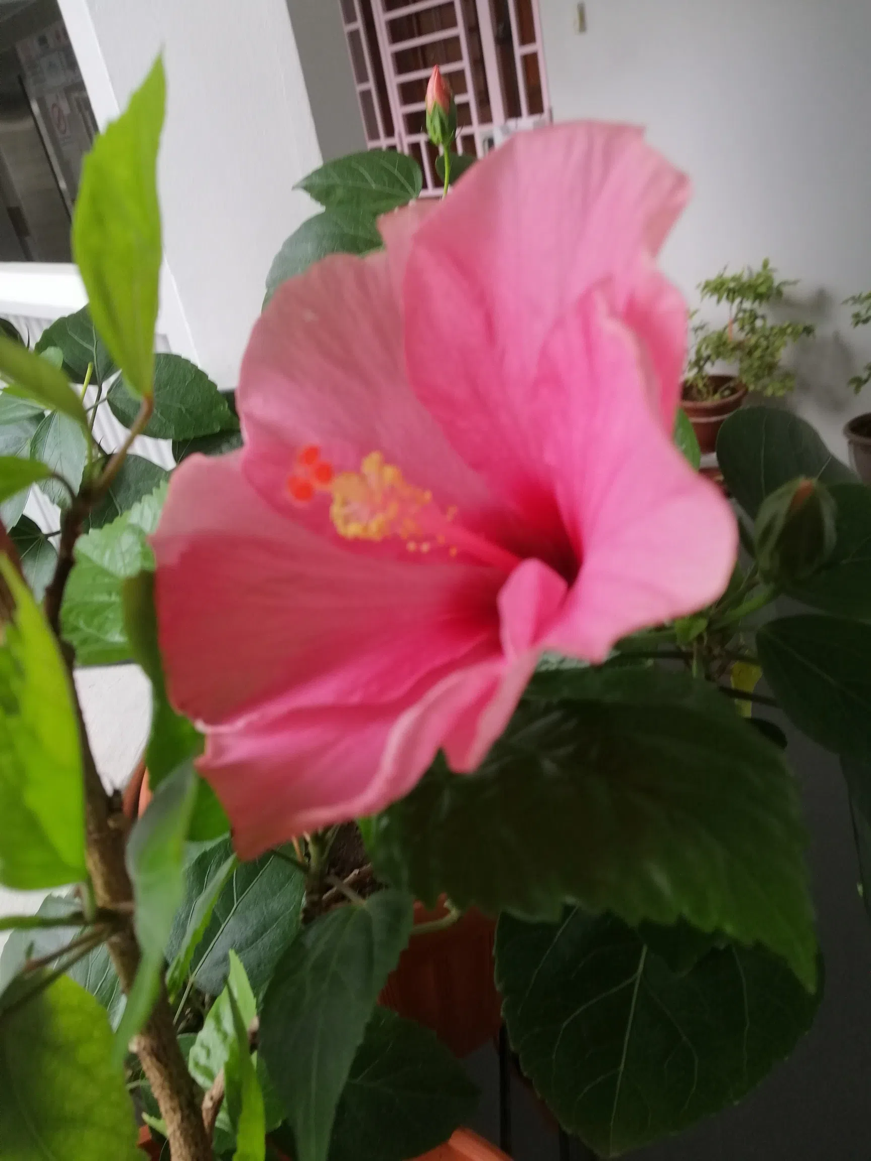 The hibiscus grows as a shrub, and smaller plants can thrive in a pot of well-draining, fertile soil.