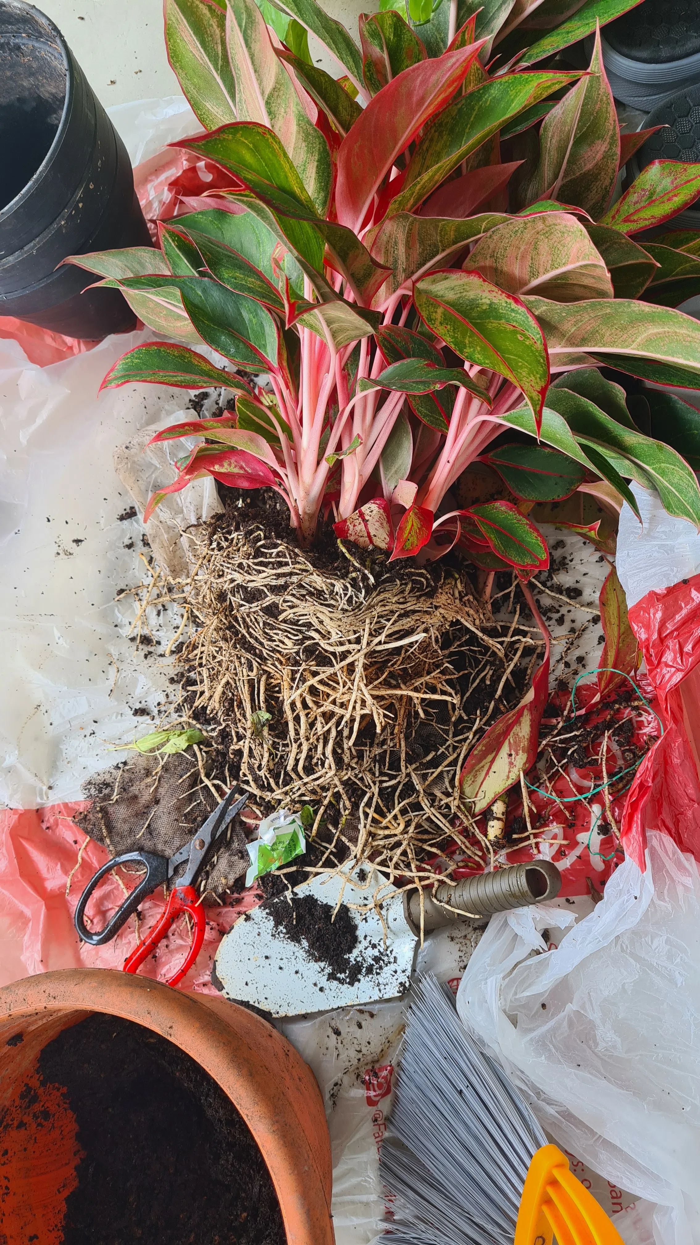 Your plant is an Aglaonema hybrid and not a Cordyline. The state and size of its root system mean it is healthy and should not be disturbed.
