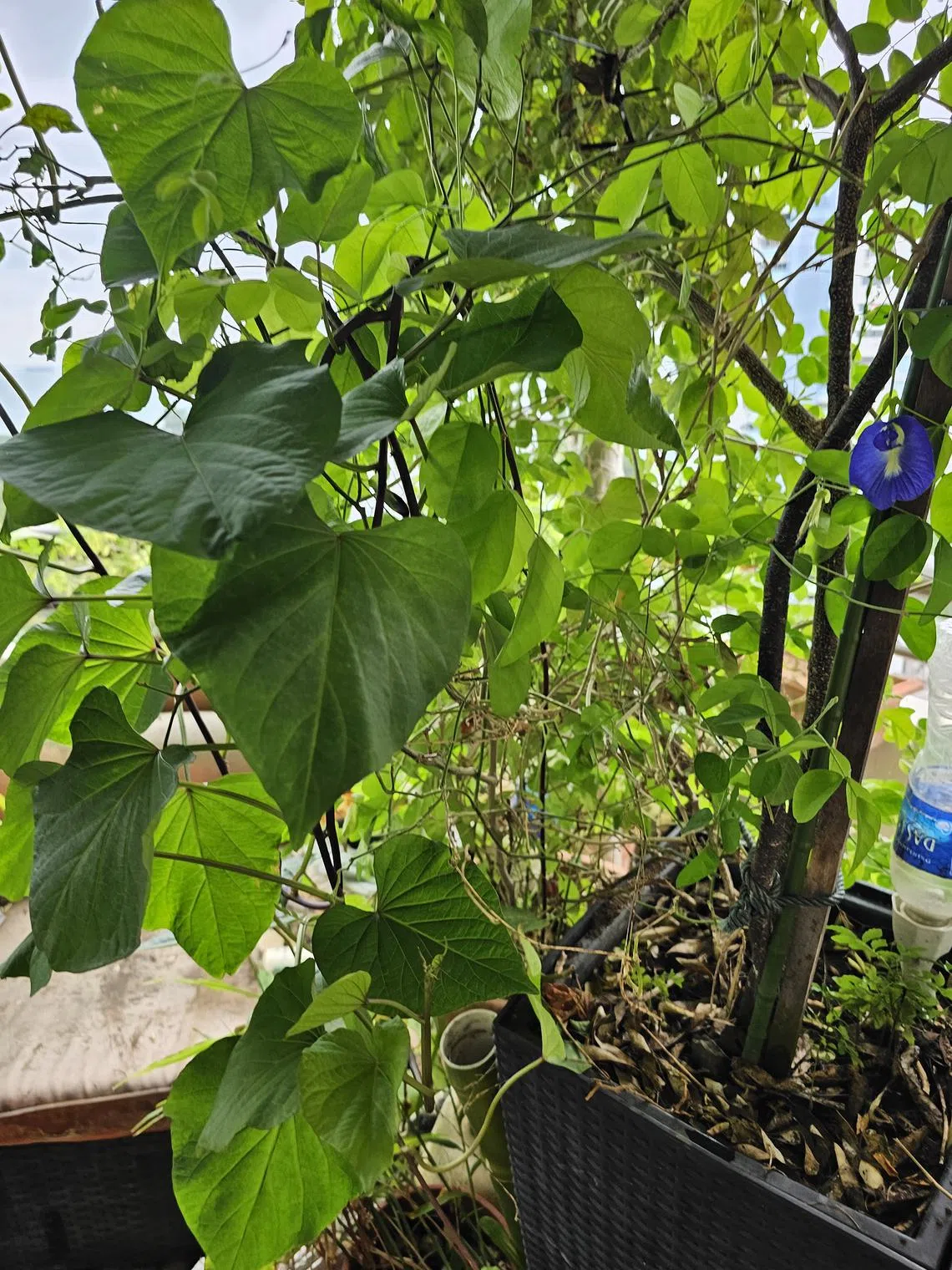 From the appearance of the vine, this is most probably a sweet potato plant. It is a relative of the morning glory and mostly grown as ground cover. Its stems can climb by twining around a support when available.