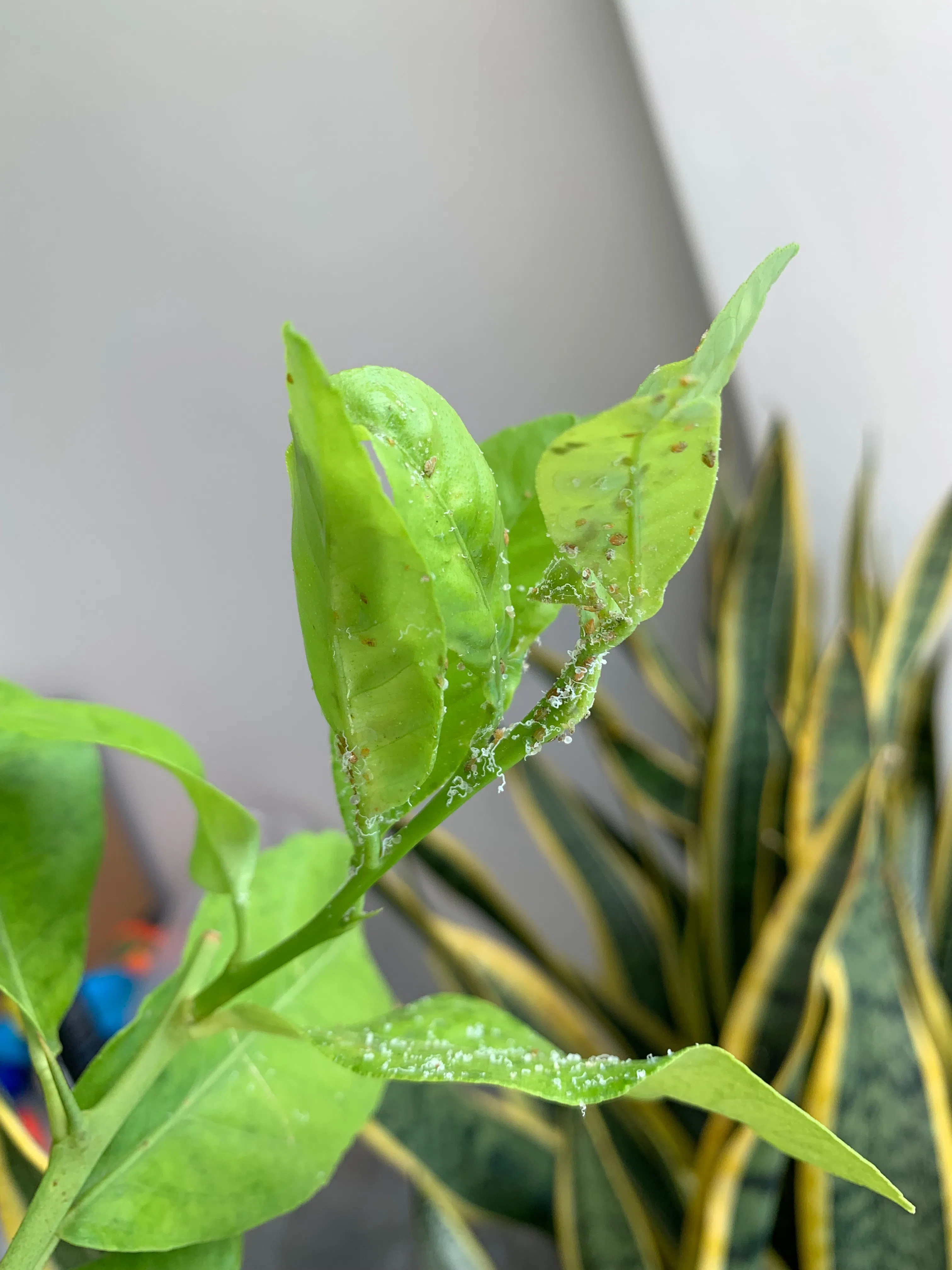 The young foliage of your lemon plant appears to be infested with aphids and other sap-sucking insects. Effective pest control requires complete coverage in order to be effective.