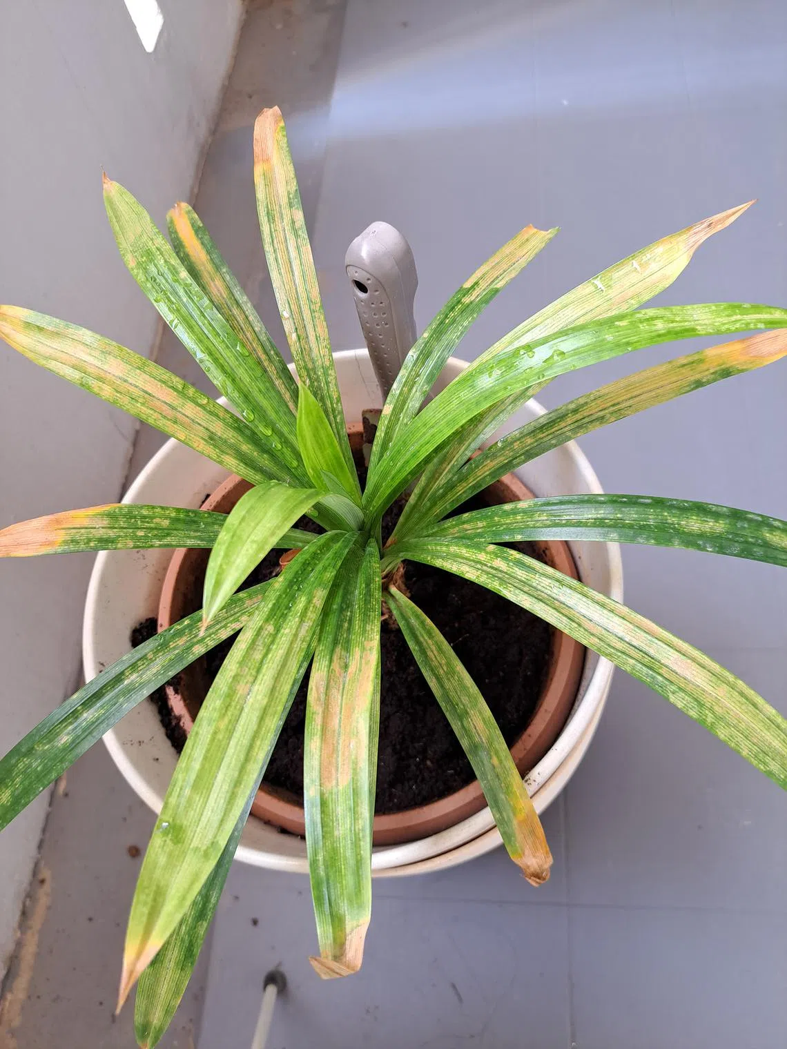 My pandan plants’ leaves have been turning yellow and brown. The plants are located in my flat’s corridor and are watered almost daily, and should be getting sufficient sunlight. What is wrong?