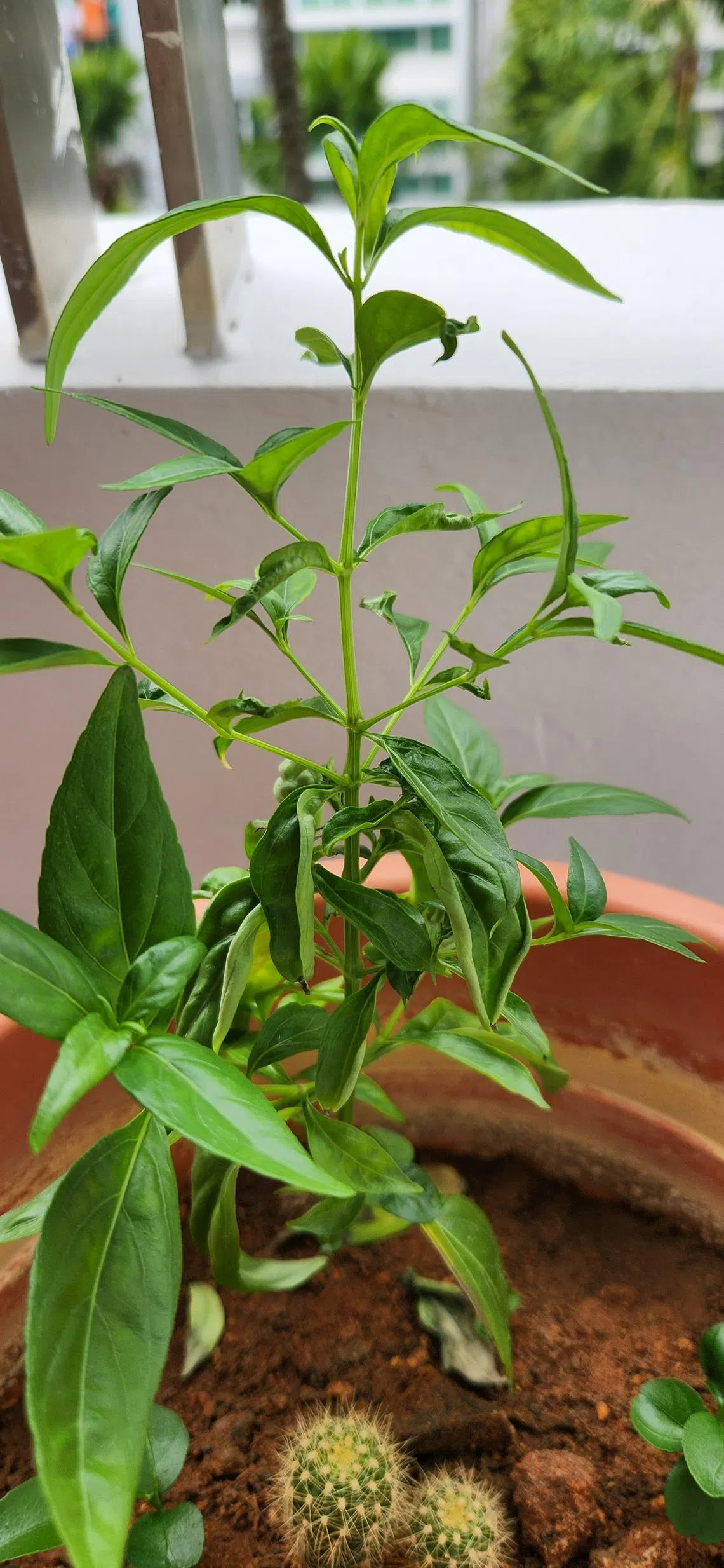 The plant is probably the Bitterweed or King of Bitters (Andrographis paniculata). Wait for it to flower to confirm its identity.