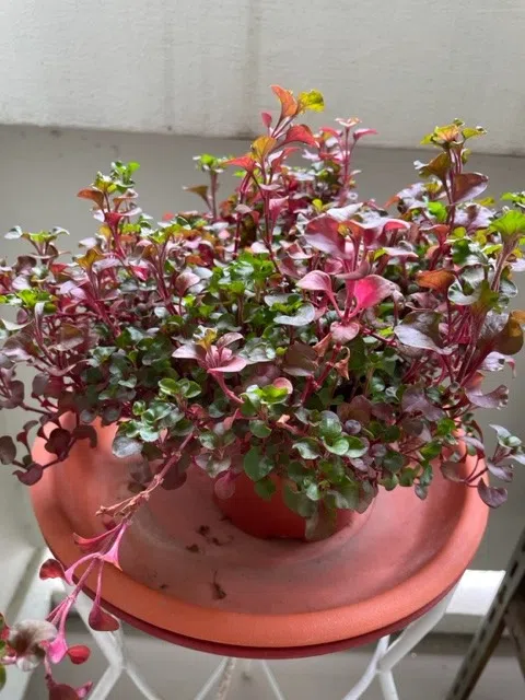 The plant appears to be a cultivar of Alternanthera ficoidea. It has red foliage and is sometimes called the Thai Watercress by local gardeners, but it is not related to the true watercress.