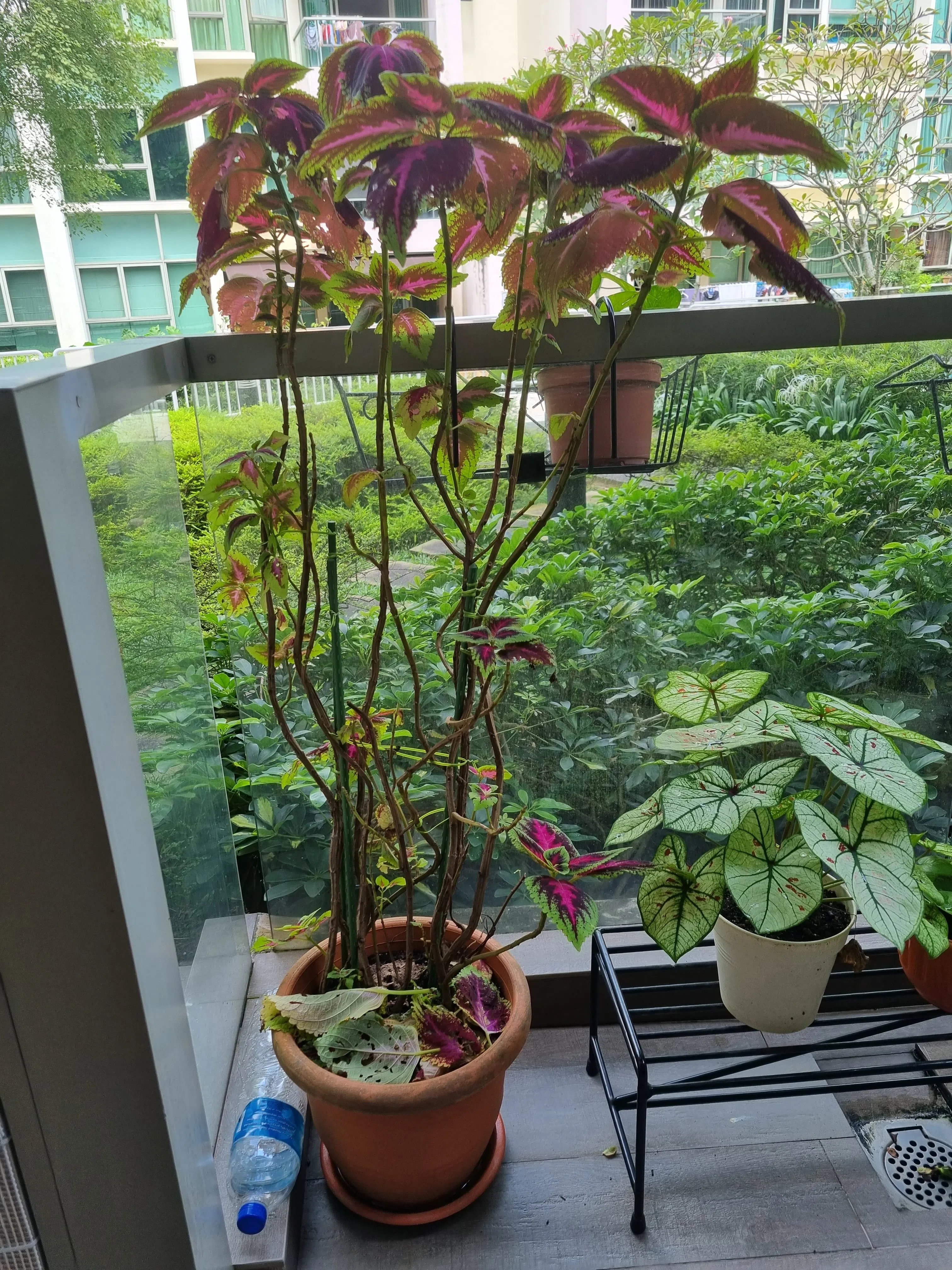 How should I keep my coleus plant healthy? It is growing quickly even after being transferred into bigger pots. Should I trim the upper foliage off to keep it under control?
