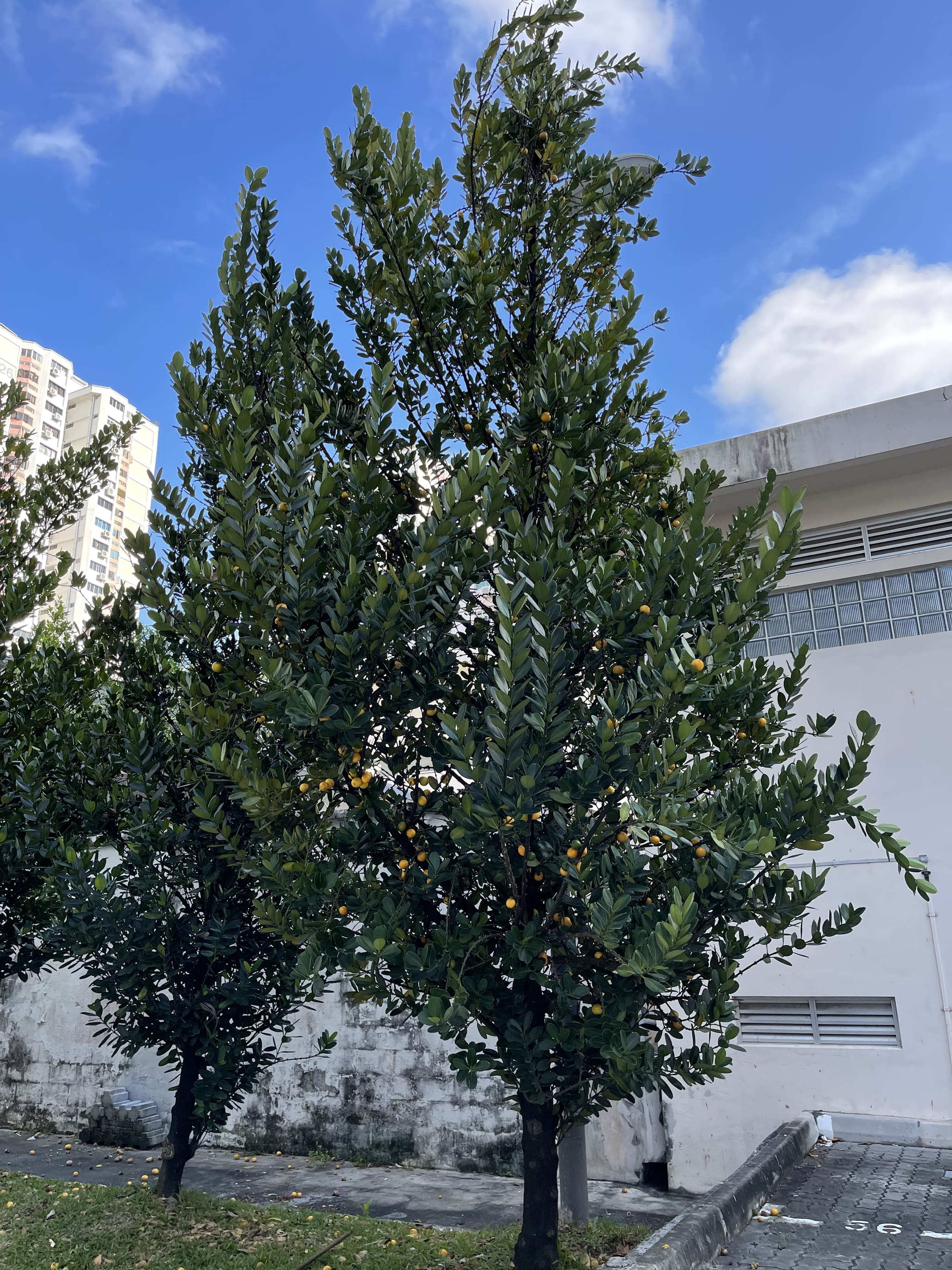 The tree is commonly known as the Happiness Tree (Garcinia subelliptica) and it is a relative of the common mangosteen. It is a slow-growing tree that is often planted in Singapore's urban gardens. The fruit, which turns orange and fragrant when ripe, is edible and has a sweet-sour flavour.