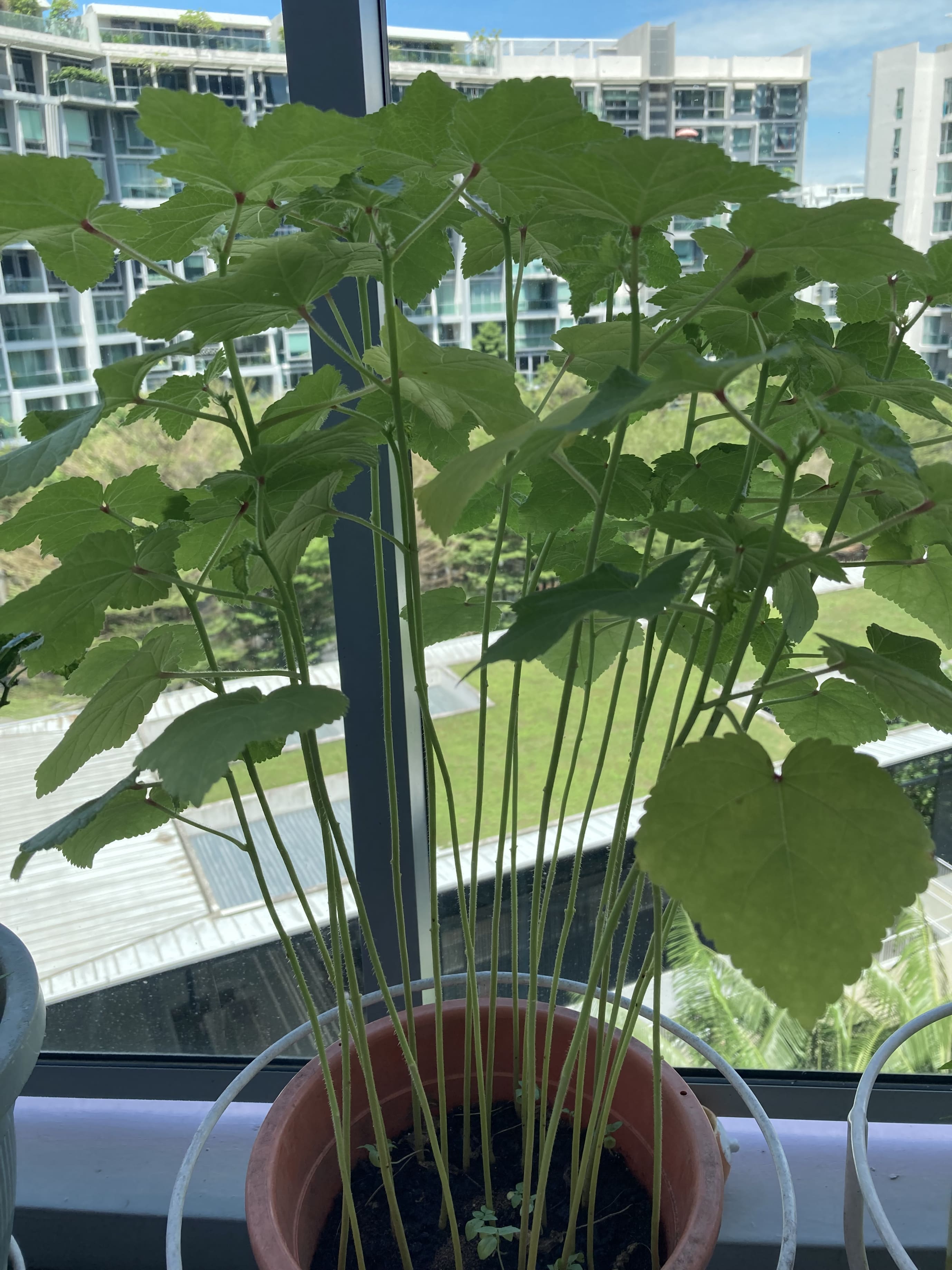 Your pot is too crowded and the plants look lanky, which indicates a lack of sunlight. Lady's fingers are large shrubs, so it is best if you grow each plant in a pot measuring at least 50cm in diameter and depth.