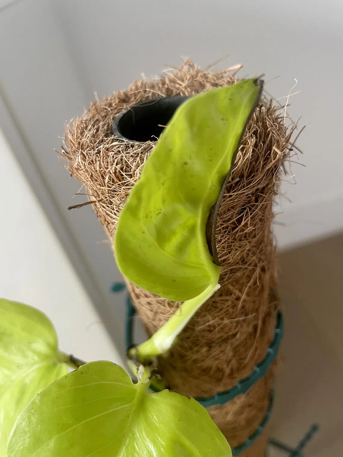 What has happened to the new leaf of my Pothos? I bought it three weeks ago and it unfurled like this. The rest of the plant seems healthy. Also, the bottom leaves are dark green but the rest of the leaves are much lighter. They are all roughly equal in size. Is there a reason for this?
