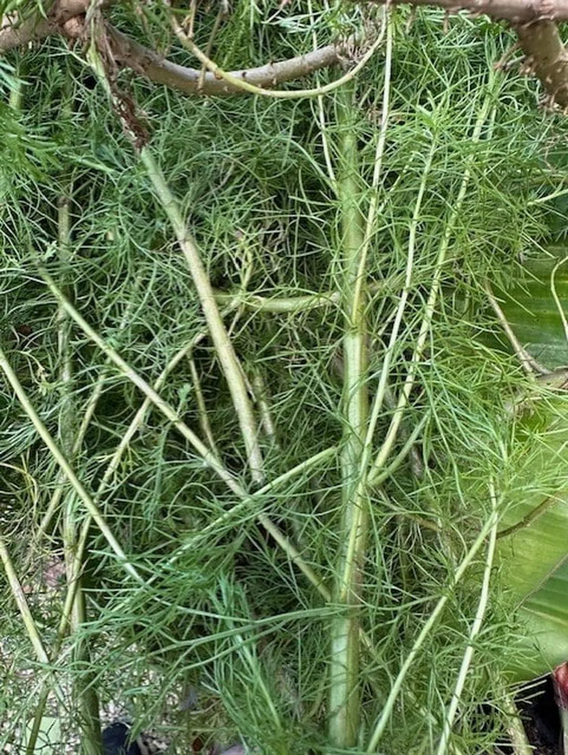 This plant is dogfennel (Eupatorium capillifolium), which grows as a tall shrub with upright stems and light green feathery leaves.