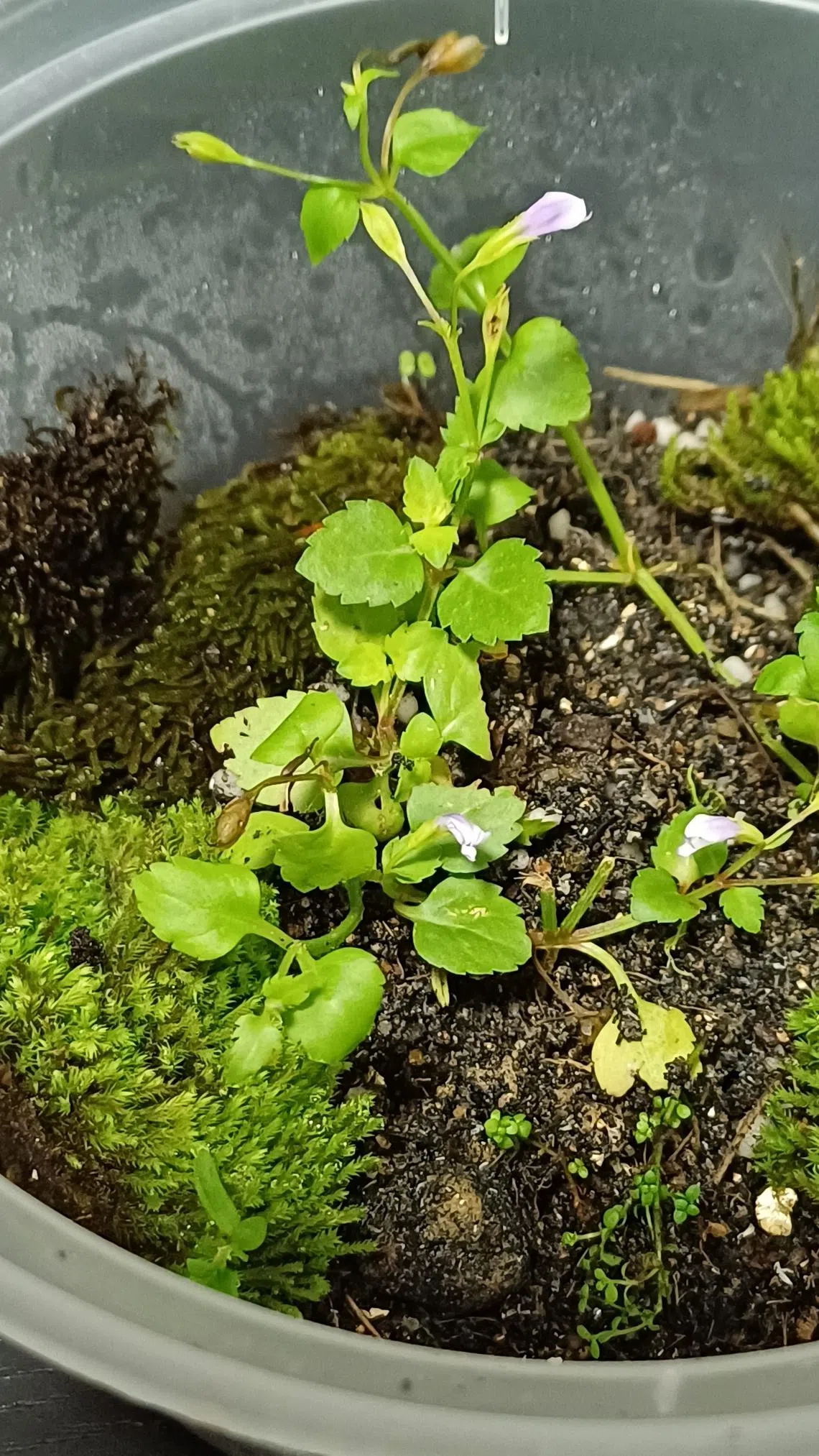The plant appears to be the Malaysian False Pimpernel (Lindernia crustacea). It can be found in both open and semi-shaded sites outdoors in local landscapes. It has a creeping growth habit and produces small, dainty purple flowers.