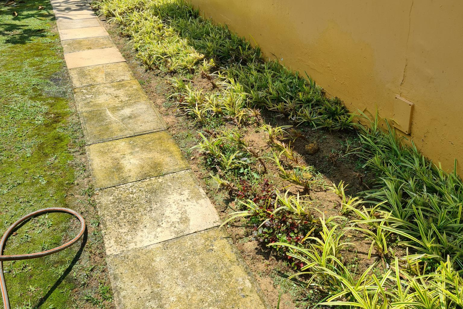 I have a strip of lawn that gets morning sun from the east. It floods easily due to soil erosion. I tried levelling the pavement tiles with sand, but over time, the pavement tiles sank again and led to the pooling of rain water, especially during heavy rain. Moreover, my roof's rain water gutter drains onto my yellow pandan grass.
