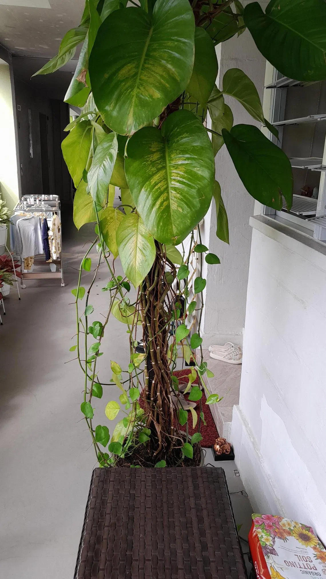 As for the trailing stems with small leaves, they are a result of stems that are not growing on a support. The Money Plant produces aerial roots on its stems that naturally adhere to a surface to grow on.