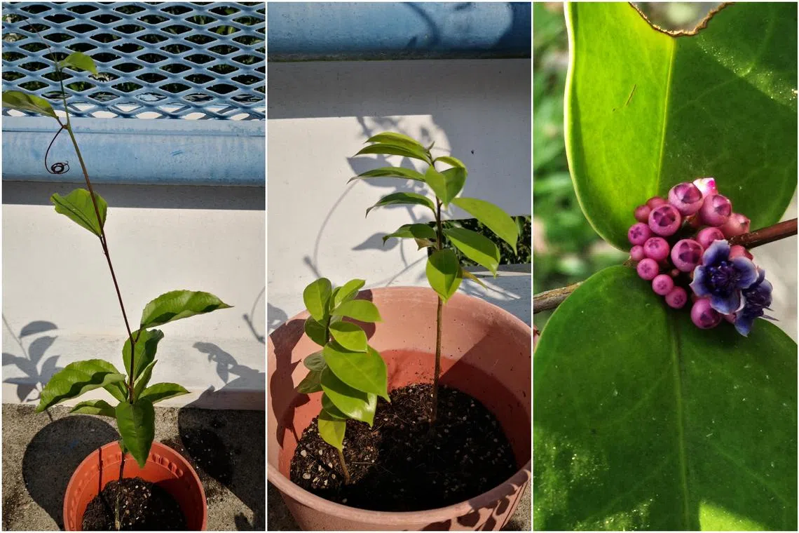 (From left) The passionfruit plant, the soursop plant and blue strawberry flowers.