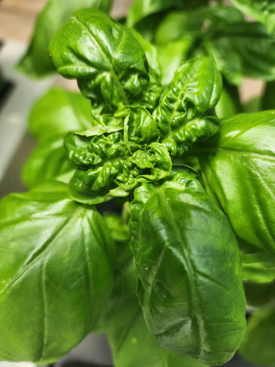 Remove the top growth of the basil plant that is badly crumpled as it harbours a lot of aphids that are difficult to reach using pesticide applications.