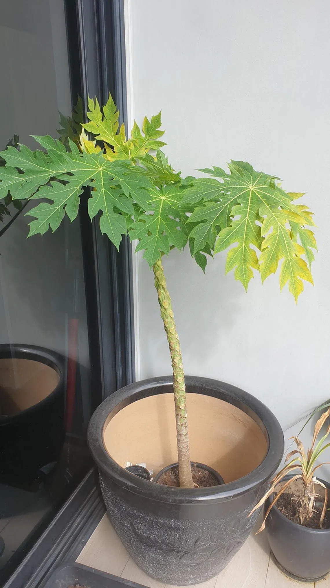 Your papaya plant is being grown in a pot that is too small and has too little soil. It needs a bigger container, preferably one measuring at least 60cm in depth and diameter.