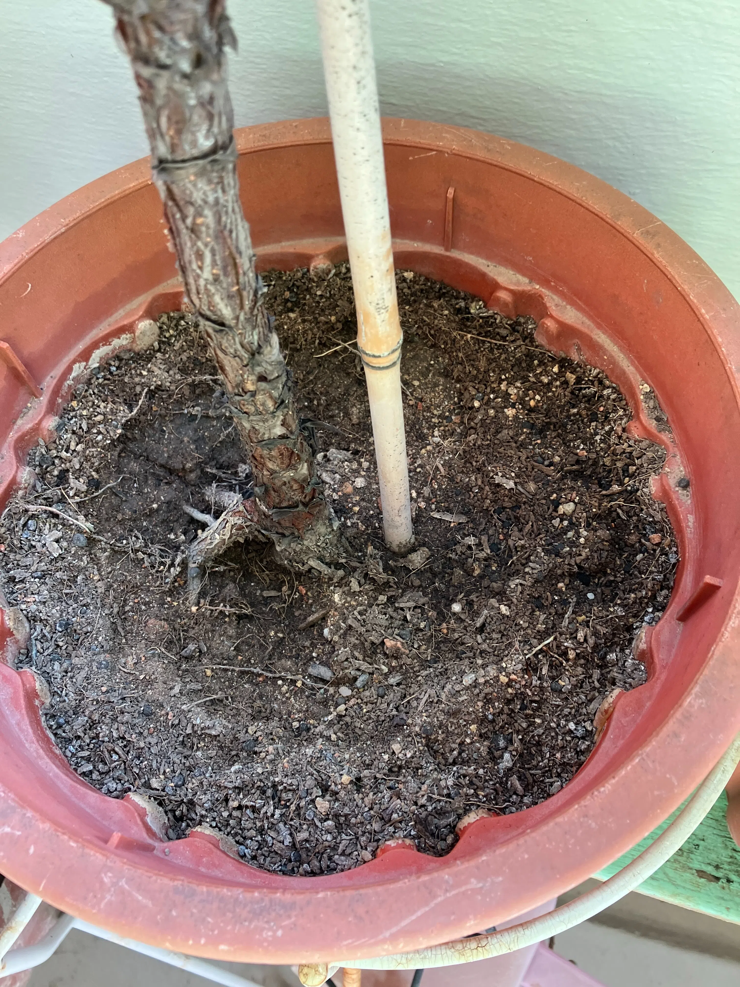 Salt residue and algae can appear on the surface of highly compacted soil. Clay-based soil in containers is especially susceptible to this.