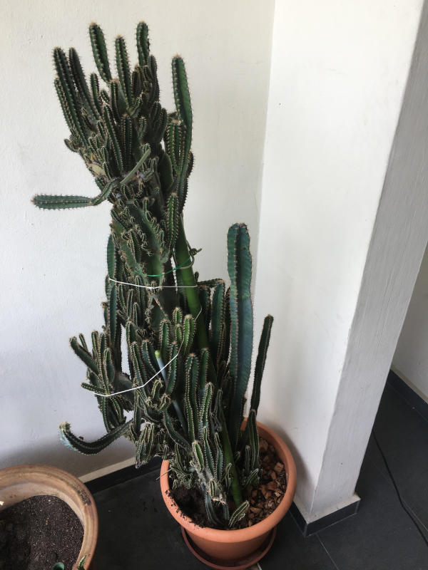 I have had this cactus - which was about 10cm tall when I got it - for 20 years. Recently, it has grown rapidly, perhaps because I repotted it twice. It now leans heavily to one side and continues to do so despite my staking it. What should I do? I am concerned it could break off if it gets too top-heavy.