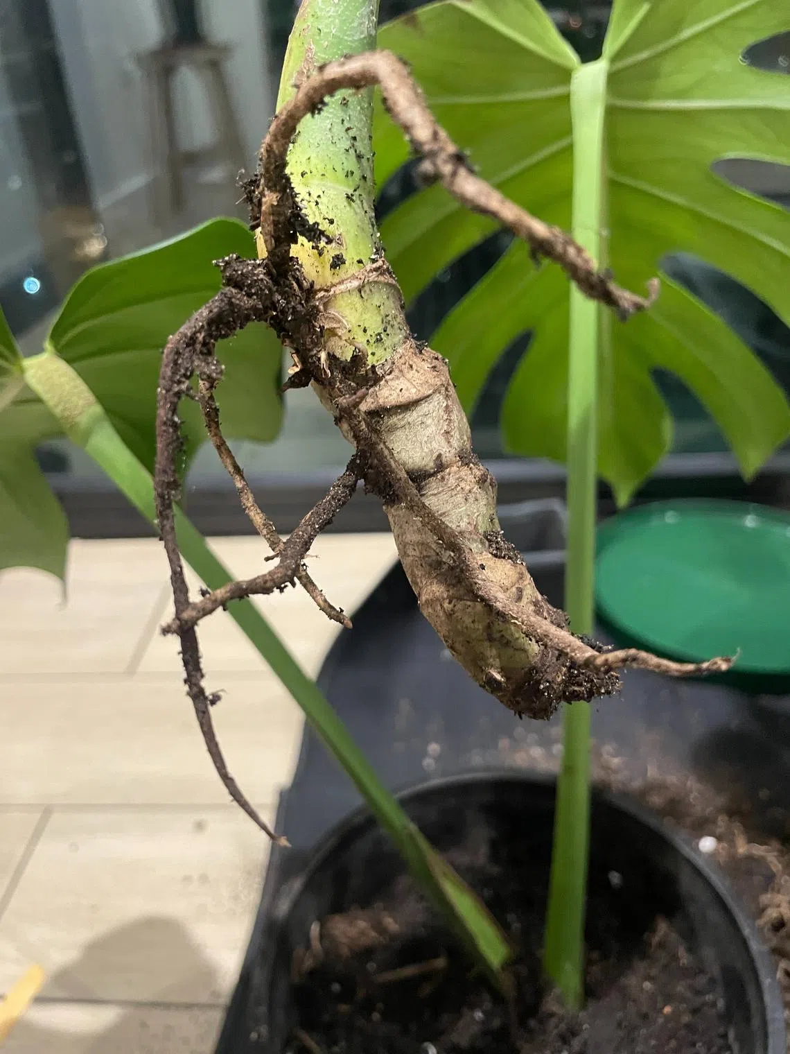I was repotting one of my Monstera deliciosa plants when the roots broke off. I immediately replanted the stem in the soil and packed it tightly around the base. How should I care for this plant? It was about to sprout a new leaf, but I am concerned that repotting has stunted its growth, as it no longer has roots with which to take up water.