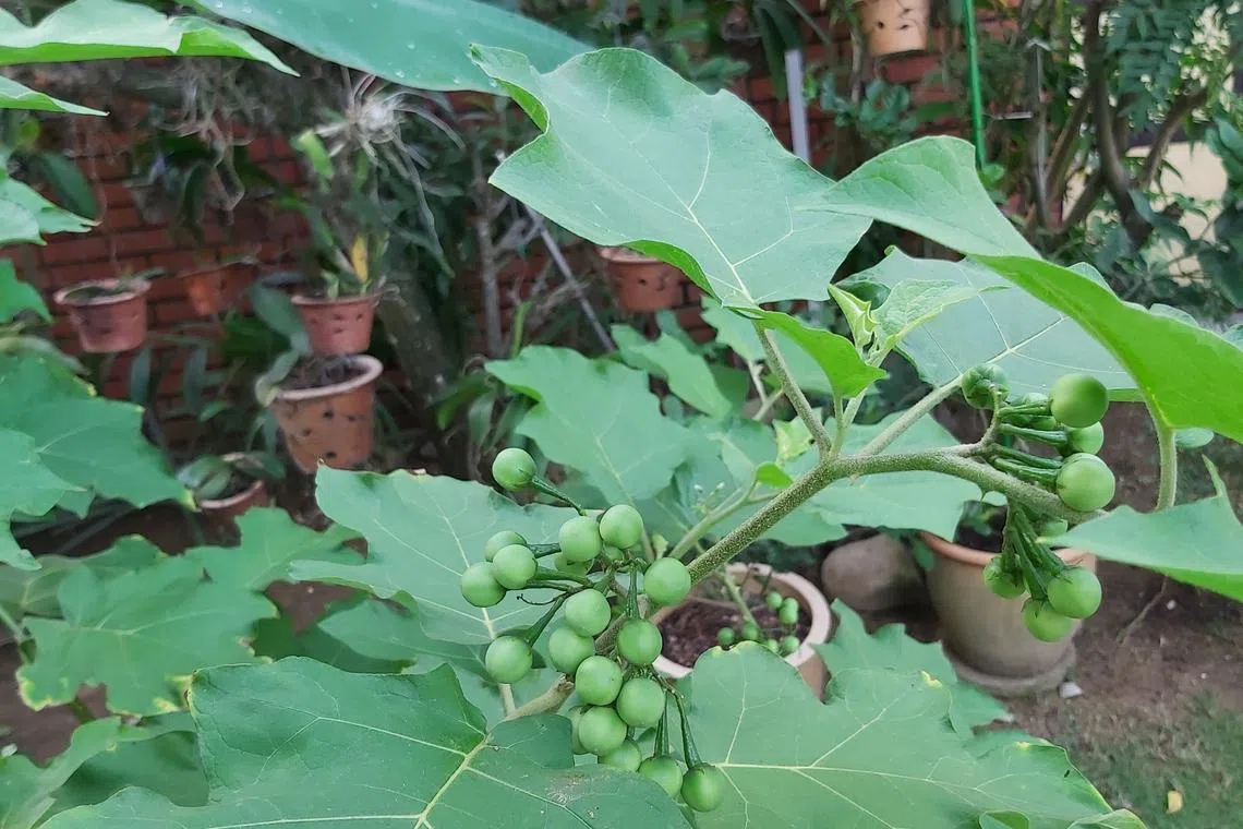 This shrub grows in the wild in Singapore. Its common names include Turkey Berry, Devil’s Fig and Terung Pipit. Its botanical name is Solanum torvum. Its immature green fruit are used in Thai green curry.