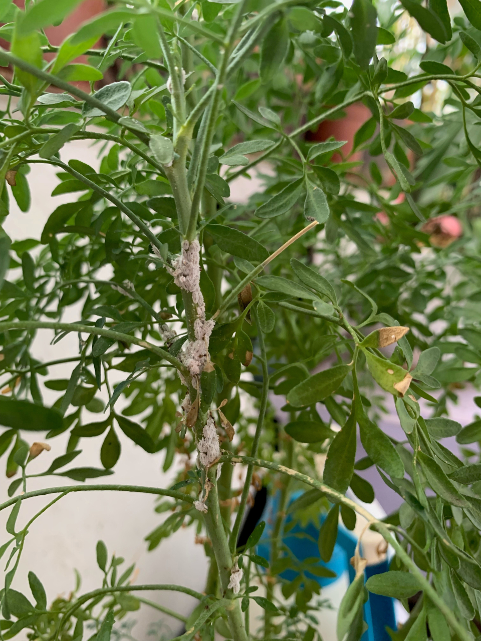 Your Indian Rue plant appears to be infested with mealy bugs. They suck sap from the plant and, in large numbers, they can weaken it. Regular inspections and prompt treatment of such infestations are key to growing pest-free plants.