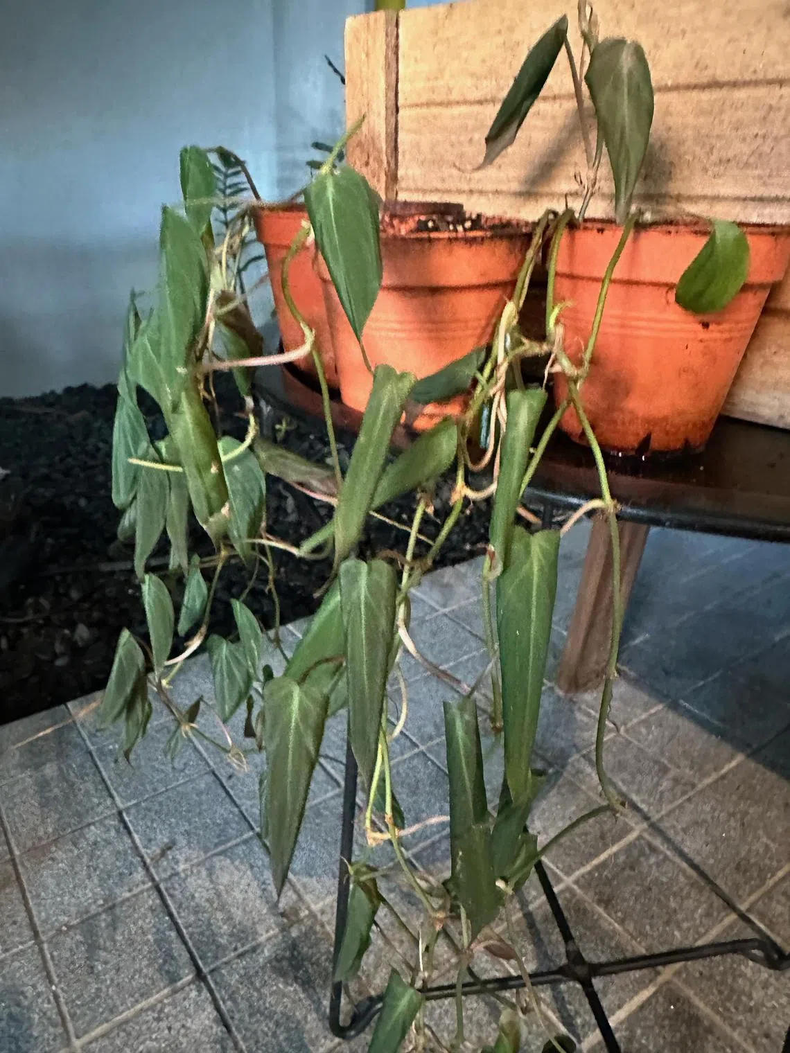 This plant species is a climber. The plant produces aerial roots along the nodes found on the stem. You can transfer the plant to a larger pot and install a sphagnum moss pole. Place the stem against the moss pole and tie it onto the pole. Moisten the moss found inside the pole. This will encourage the aerial roots to grow into moss.