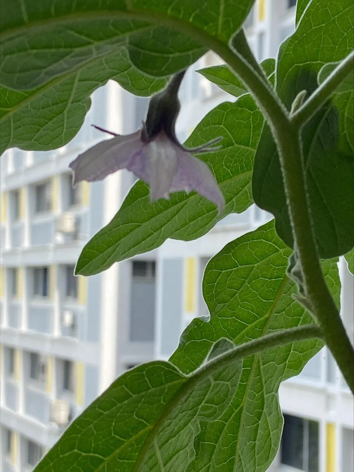 A brinjal plant grown in a high-rise environment is likely to require hand-pollination to encourage fruit production.