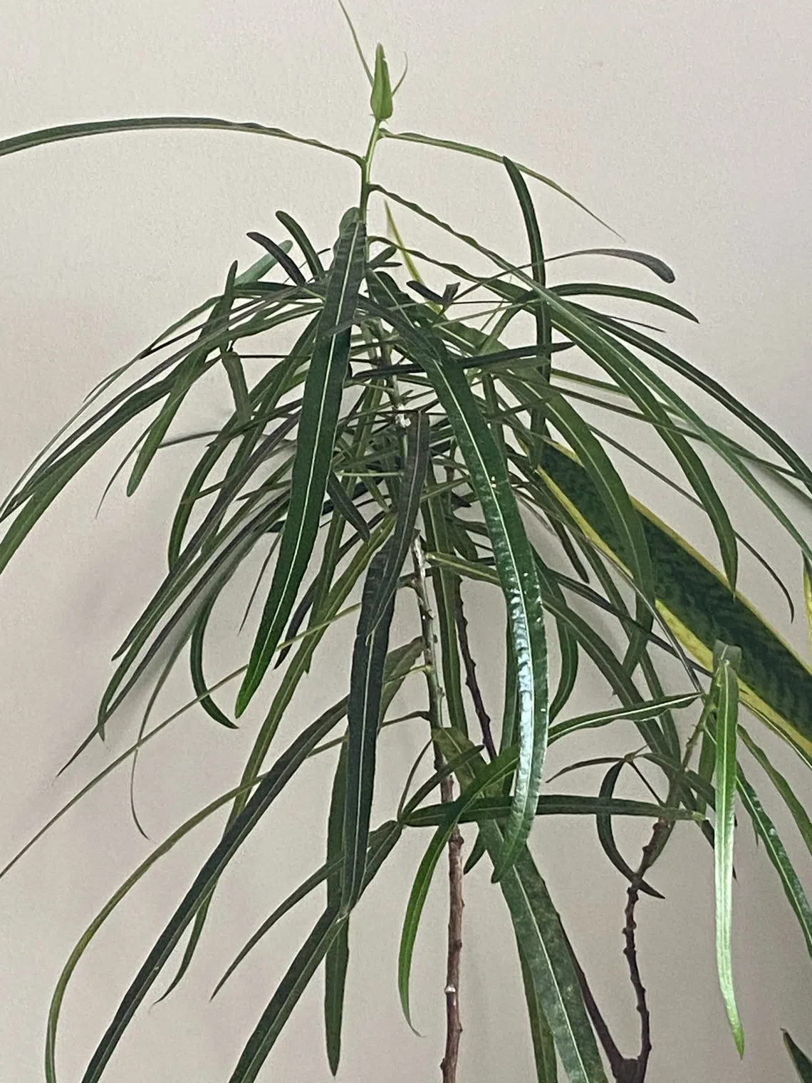 This plant is commonly known as the Queensland Bottle Tree (Brachychiton rupestris). It is a slow-growing and drought-tolerant plant. Water it thoroughly and let it dry out before watering again. In hot and humid Singapore, ensure the plant is kept in a gritty and well-draining growing mix to ensure proper drainage and aeration.