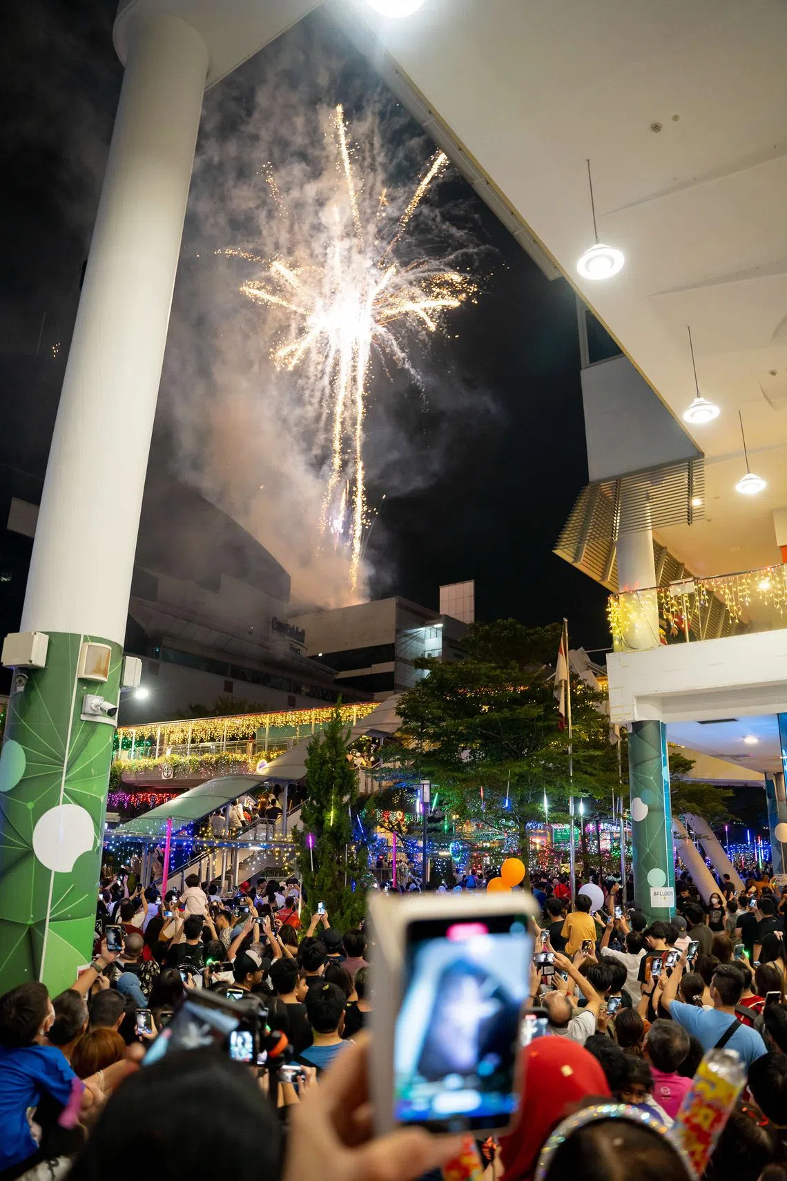 Fireworks going off after midnight at the Town Square of Our Tampines Hub to welcome 2022.